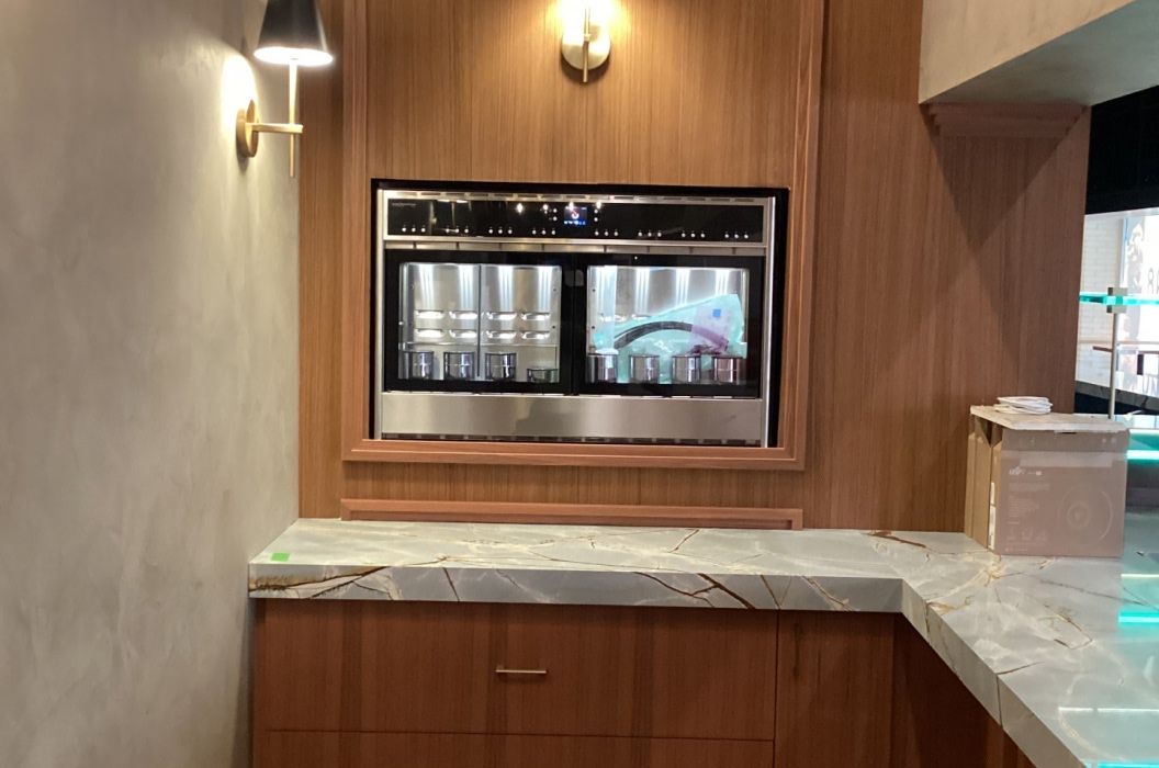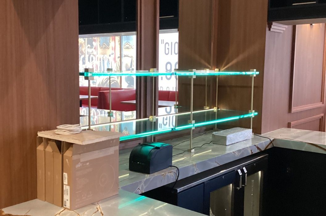 For our restaurant project with Slick Design, we brought our clients' visions to life by selecting the perfect stone—Blue Roma Quartzite from MSI—for the bar, bus station, and hostess stand.