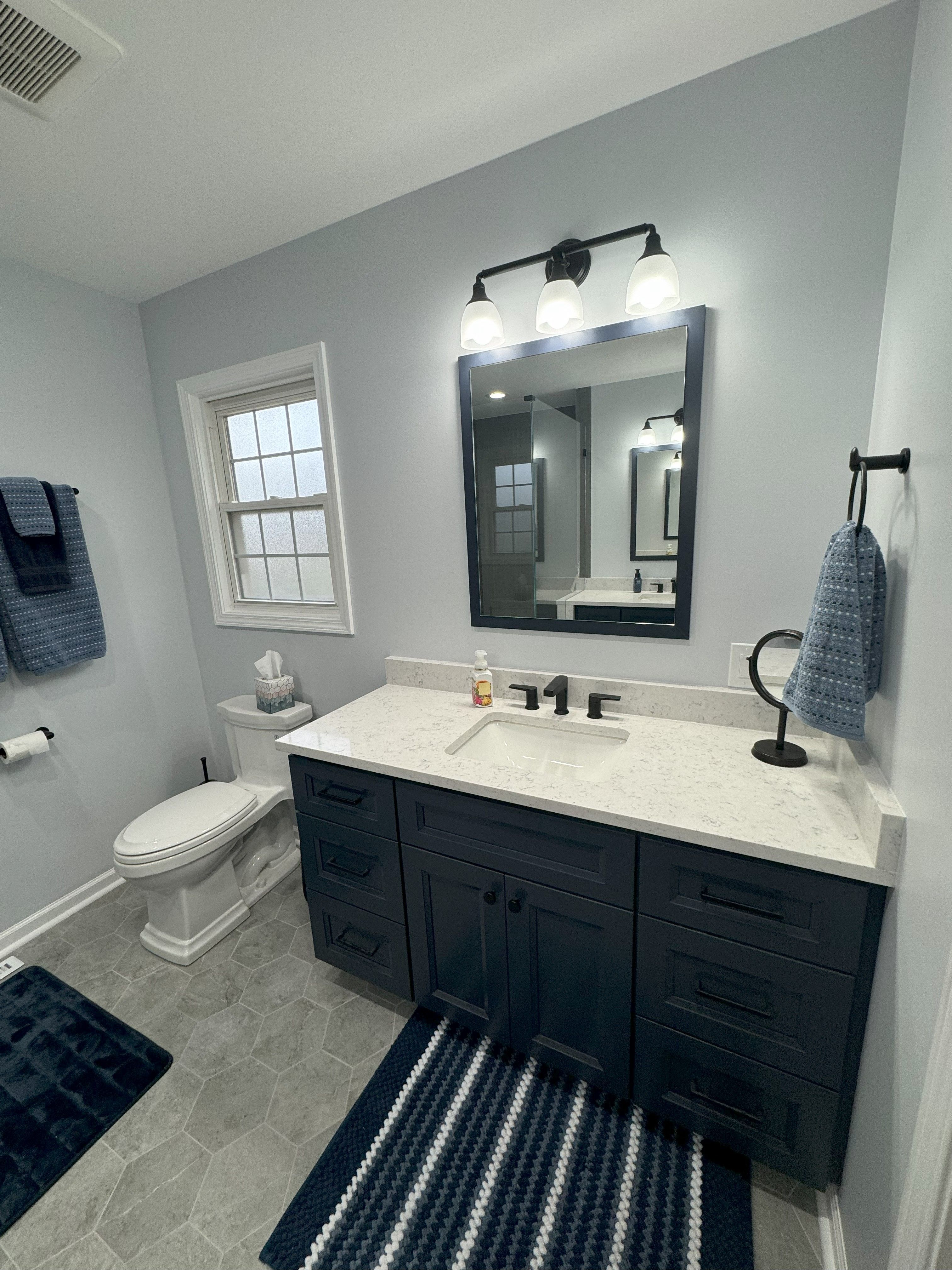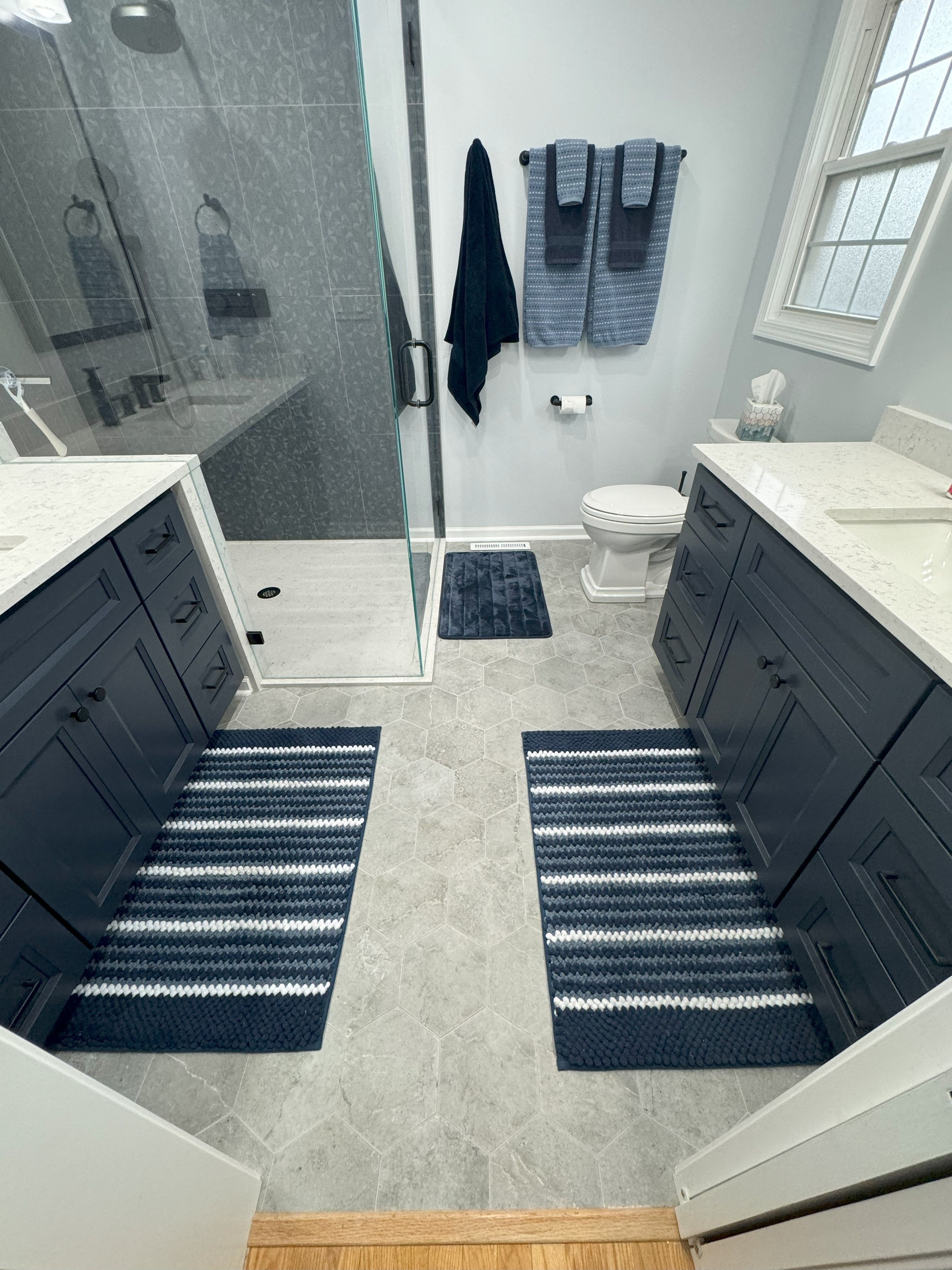 This Arlington Heights family wanted a fresh new look for their master bathroom. They chose Daltile’s Rocky Mountain Quartz for the vanity tops, shower bench, shower niche, and Atlantis’ Trident Quartz Shower Base. Using the same material throughout created a seamless flow in the space.