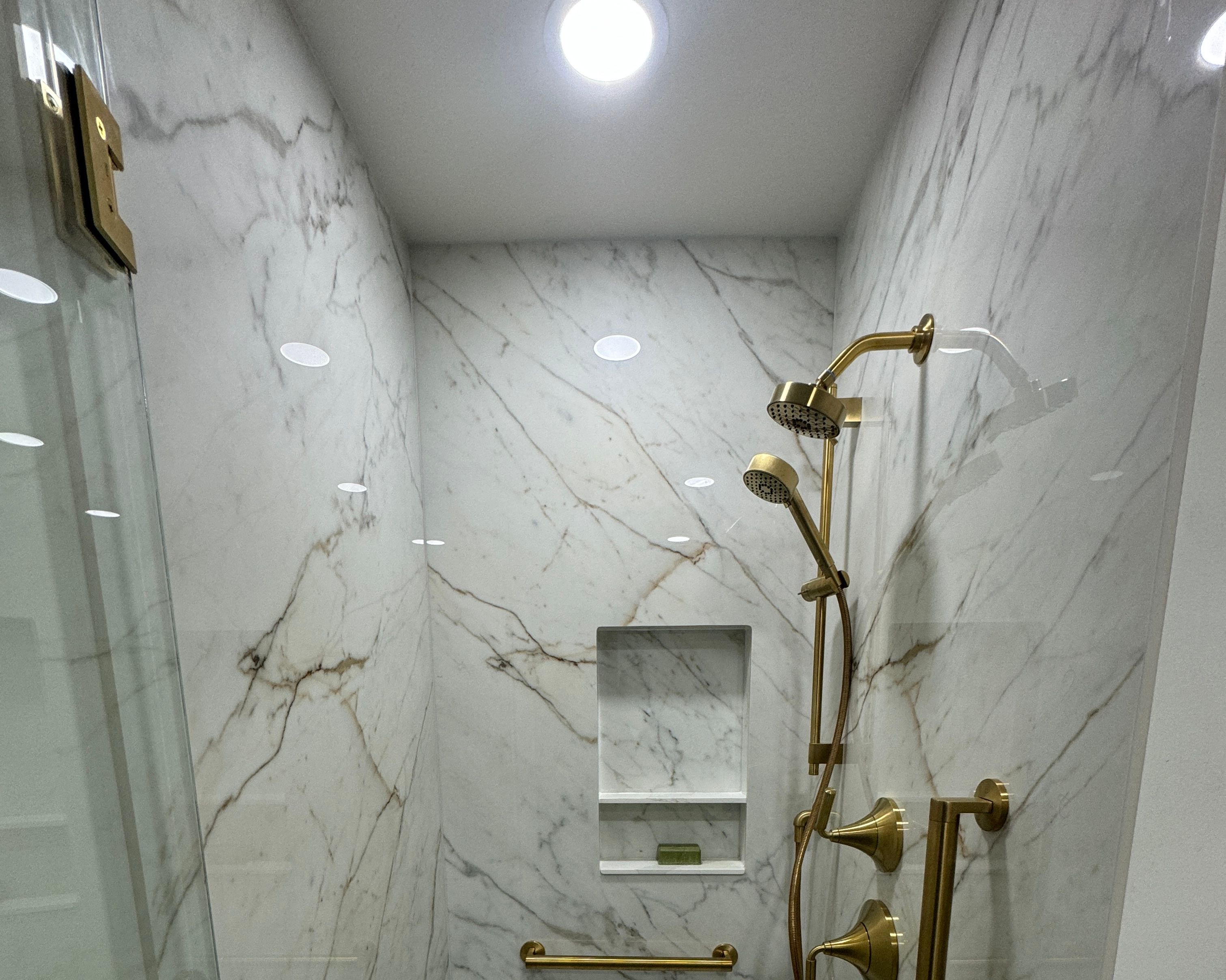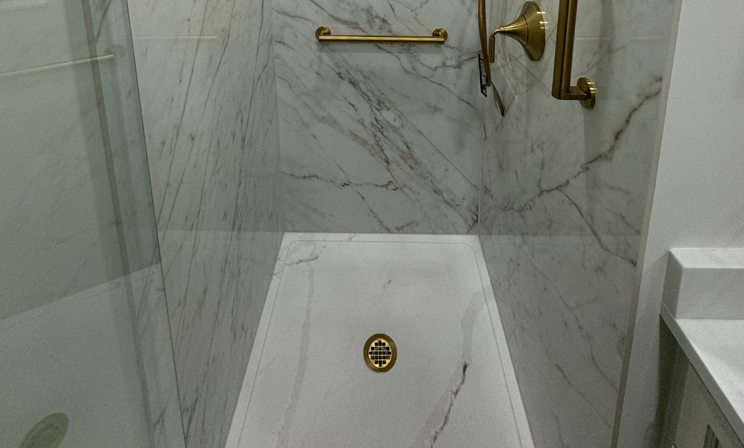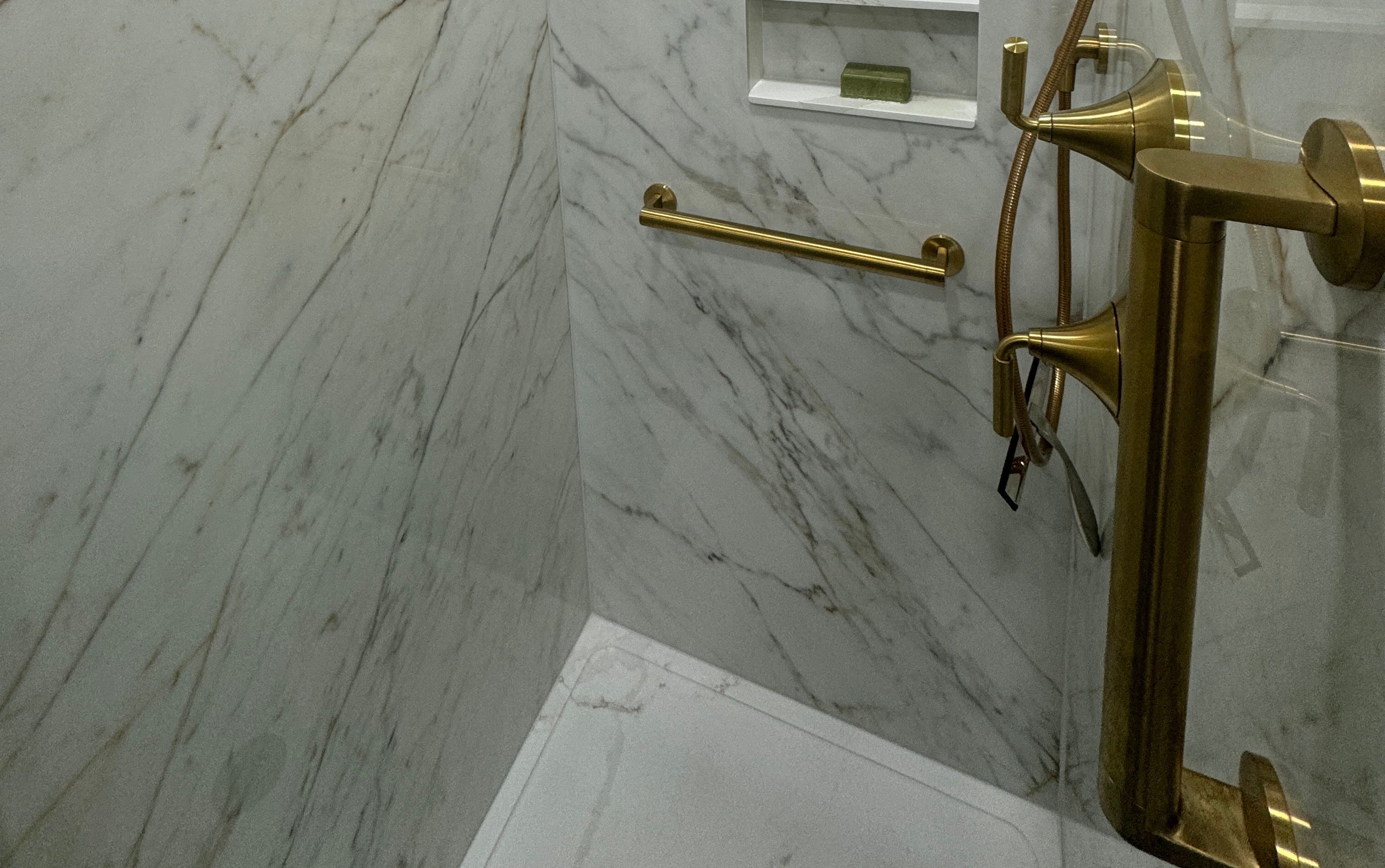During their master bathroom renovation, these Buffalo Grove homeowners selected the striking Daltile Diamond Mine Glossy Porcelain for the shower walls and Daltile Calacatta Alabaster quartz for the trident quartz shower base, creating a stunning focal point in their updated space.