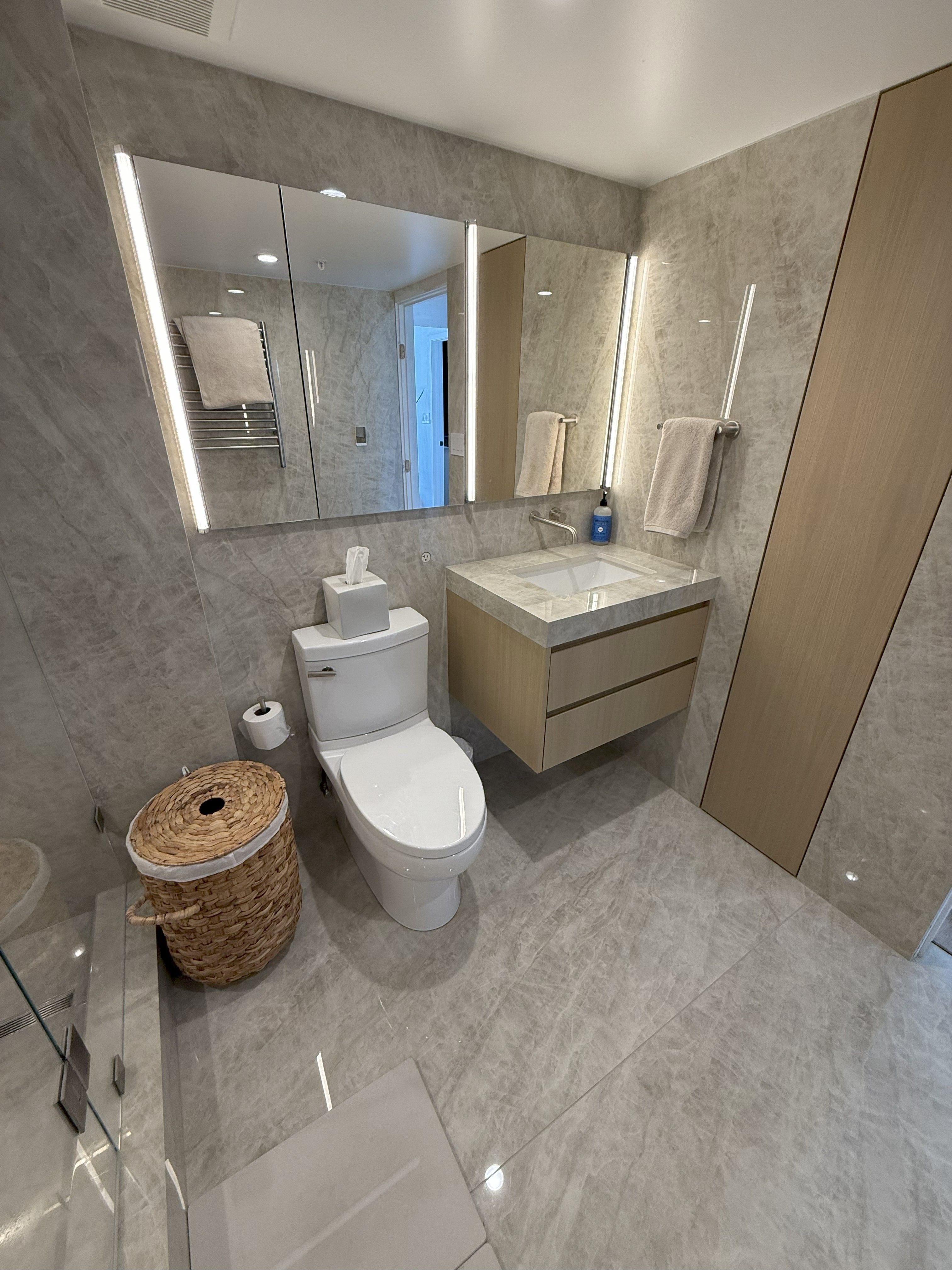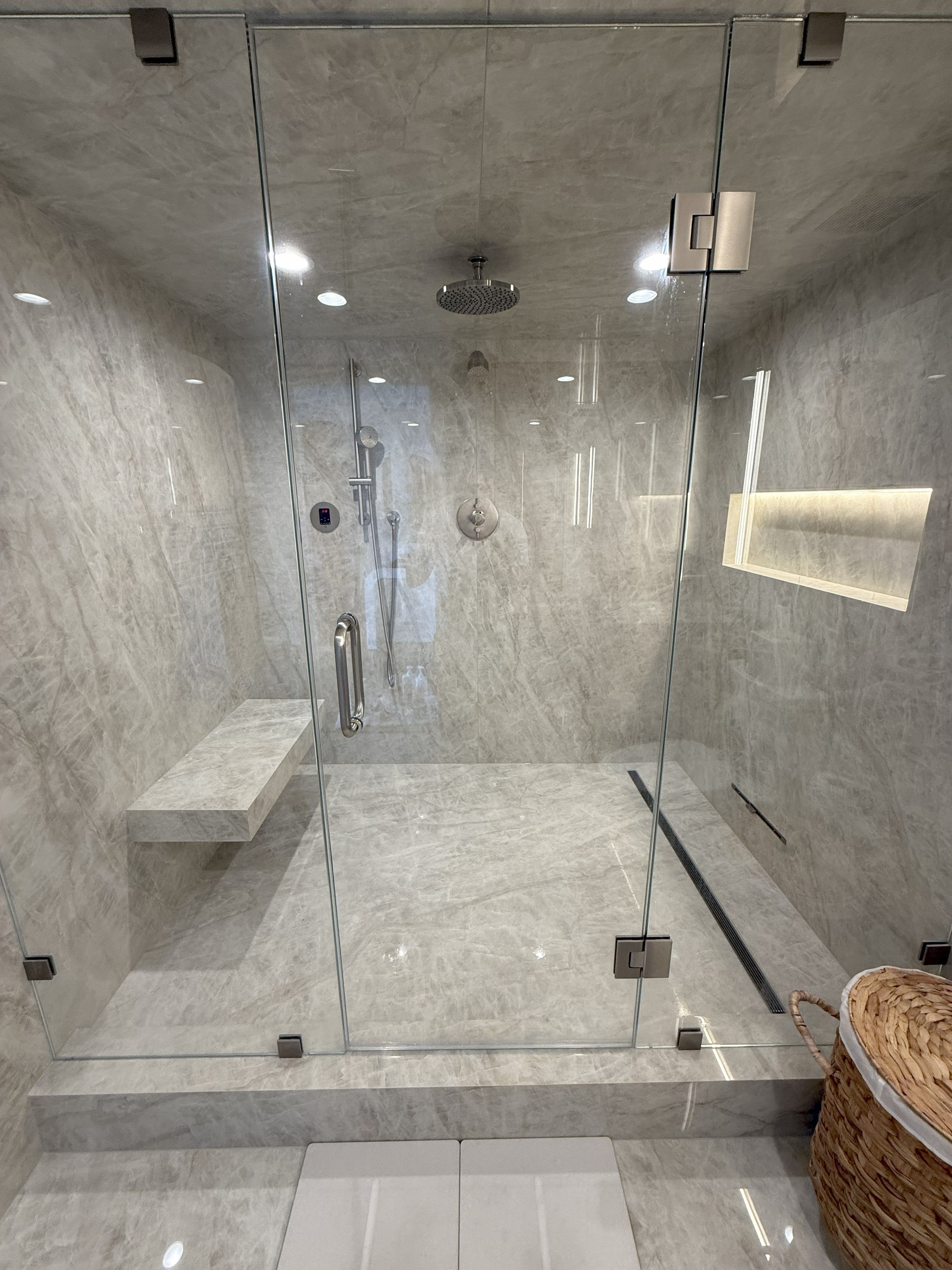 This Chicago homeowner selected the stunning Taj Mahal Porcelain for every surface in their upgraded master bathroom, achieving a sleek, luxurious, and timeless design.