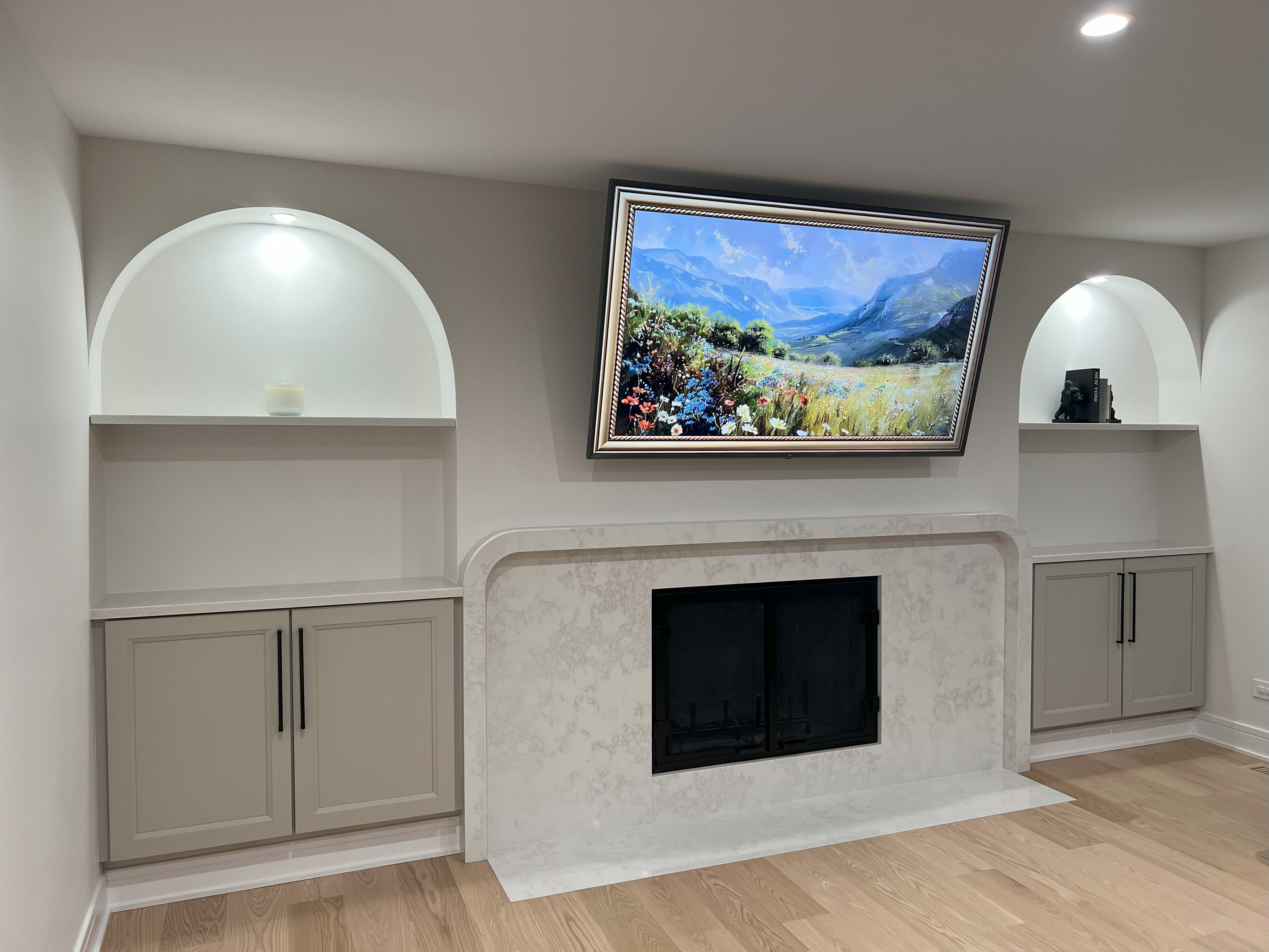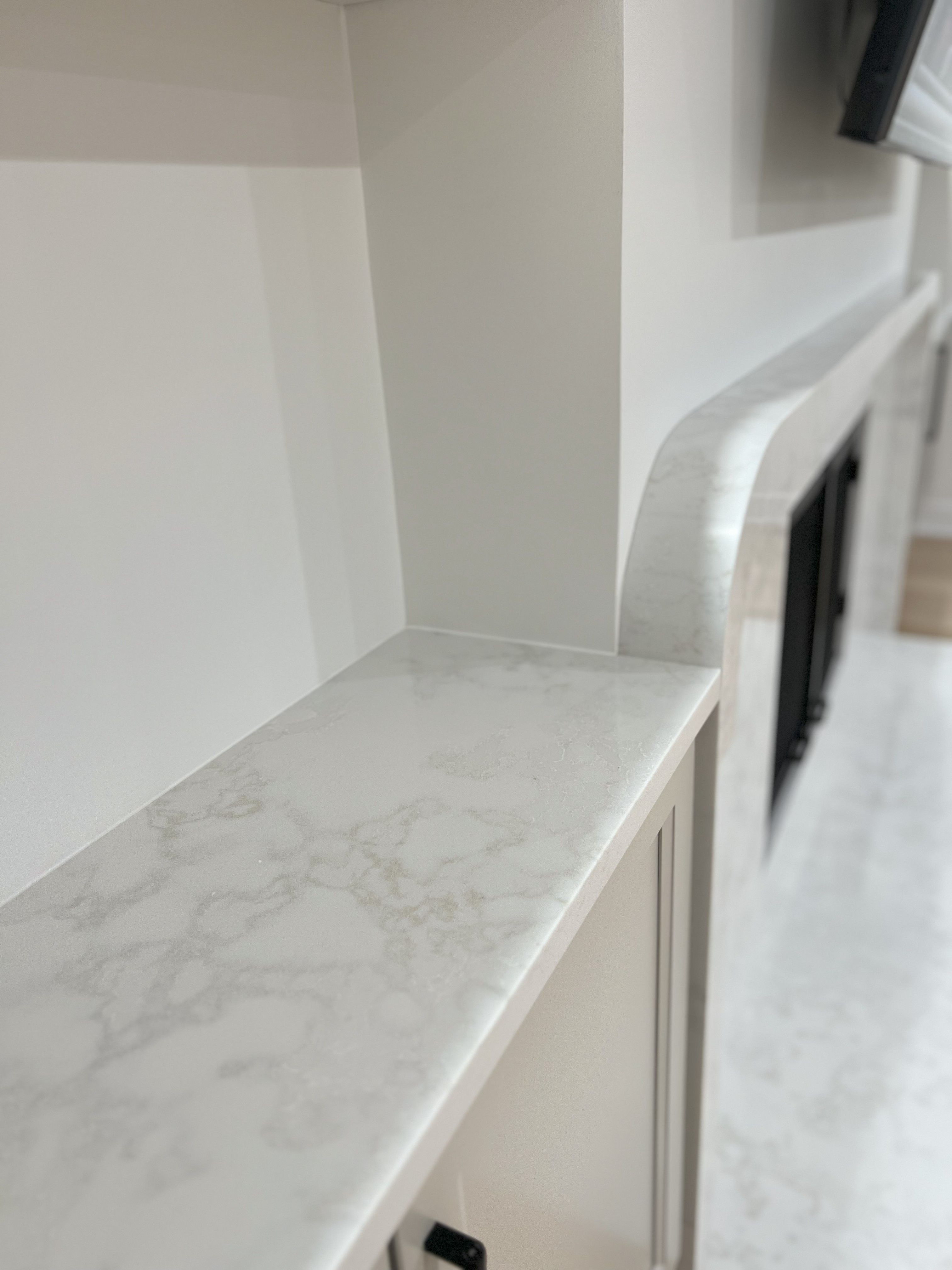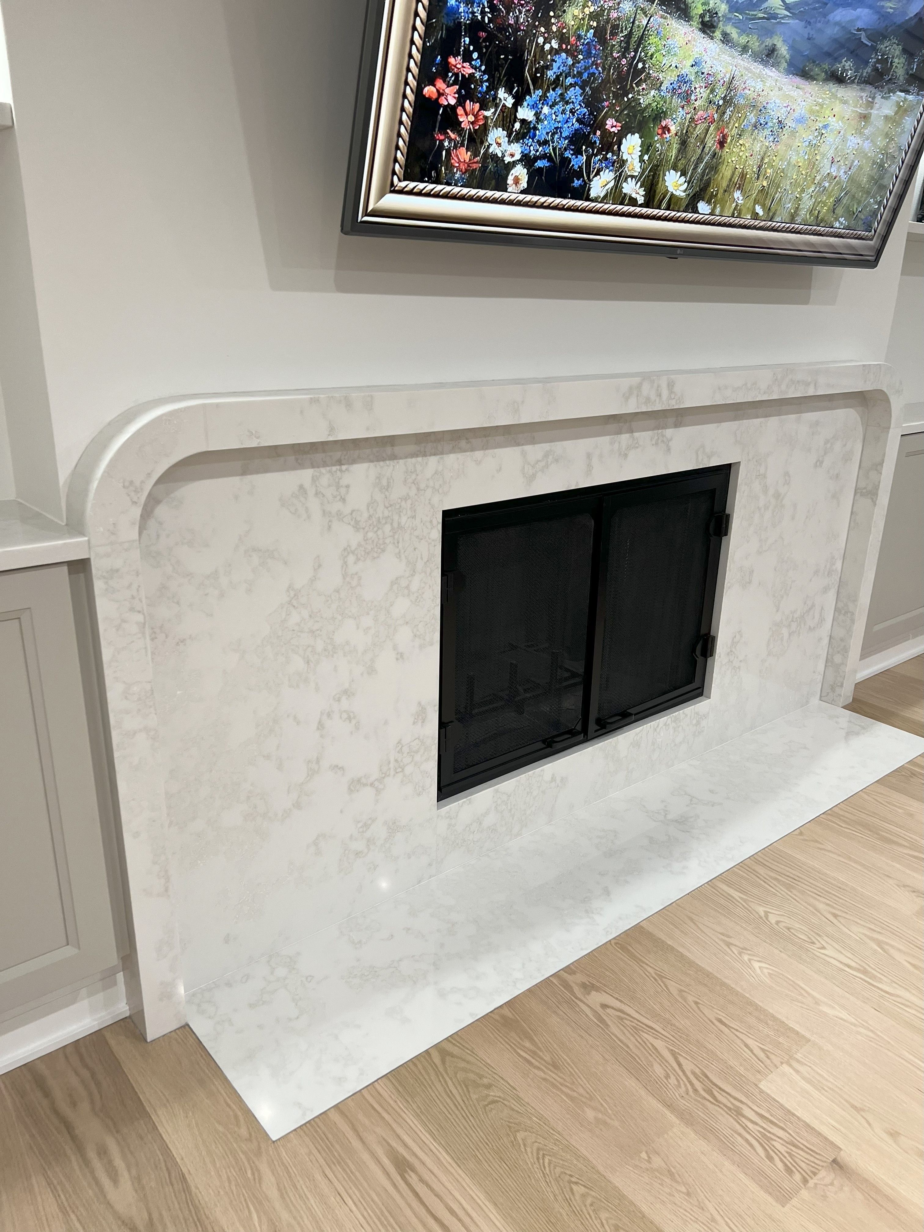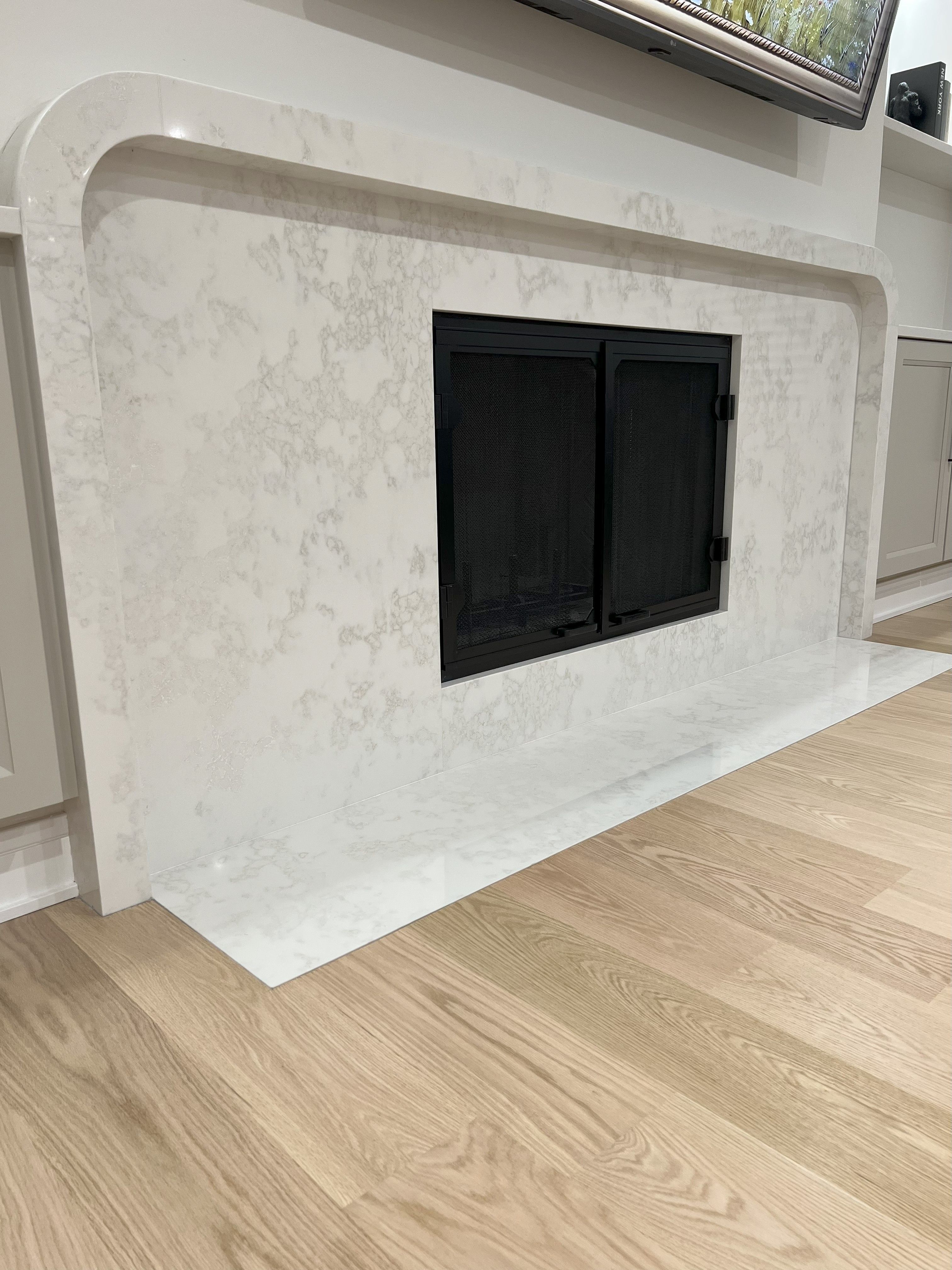 These Green Oaks homeowners elevated their living space with a stunning custom fireplace clad in Moongaze quartz from Daltile, adding timeless elegance and warmth to their home.