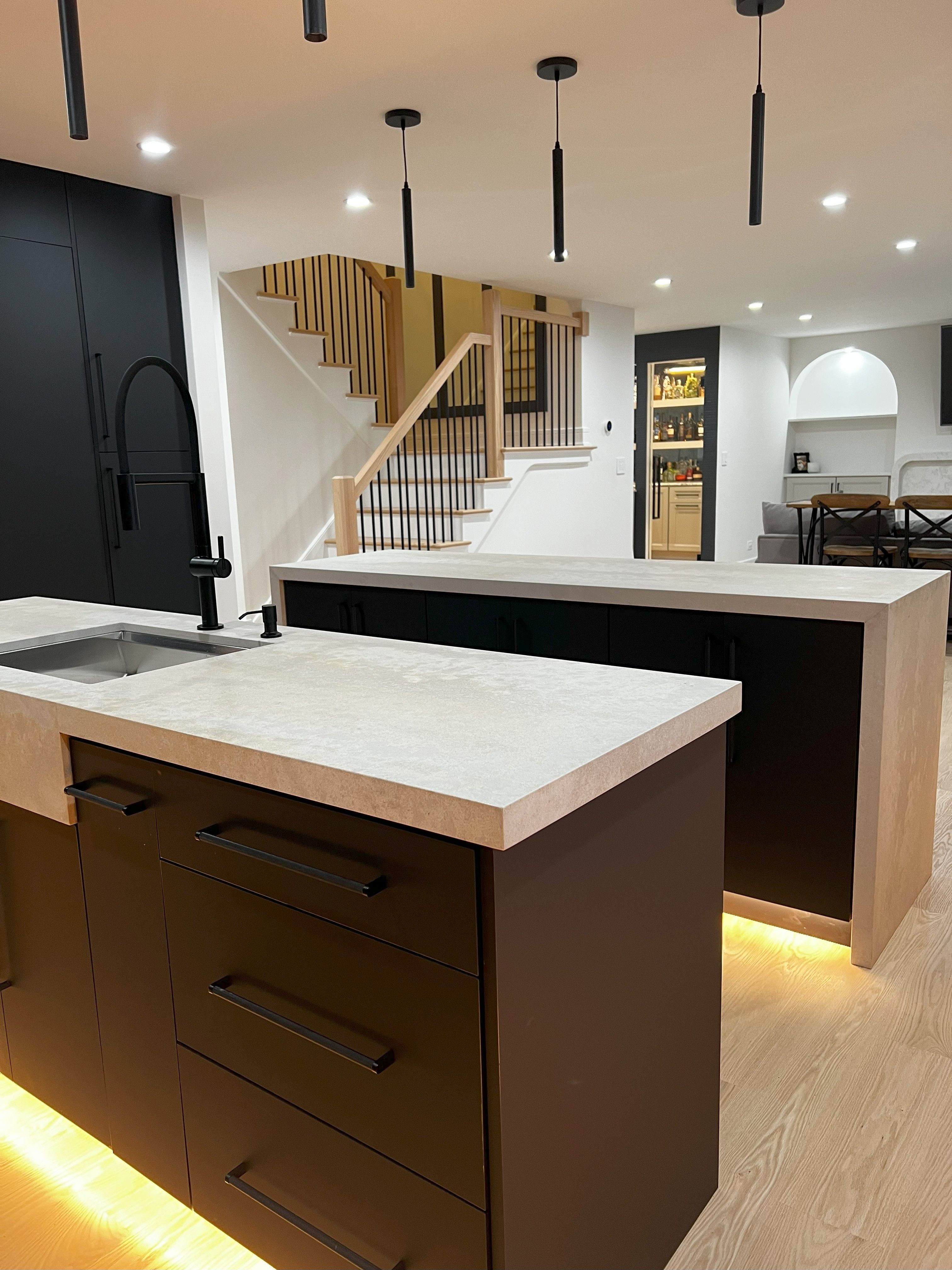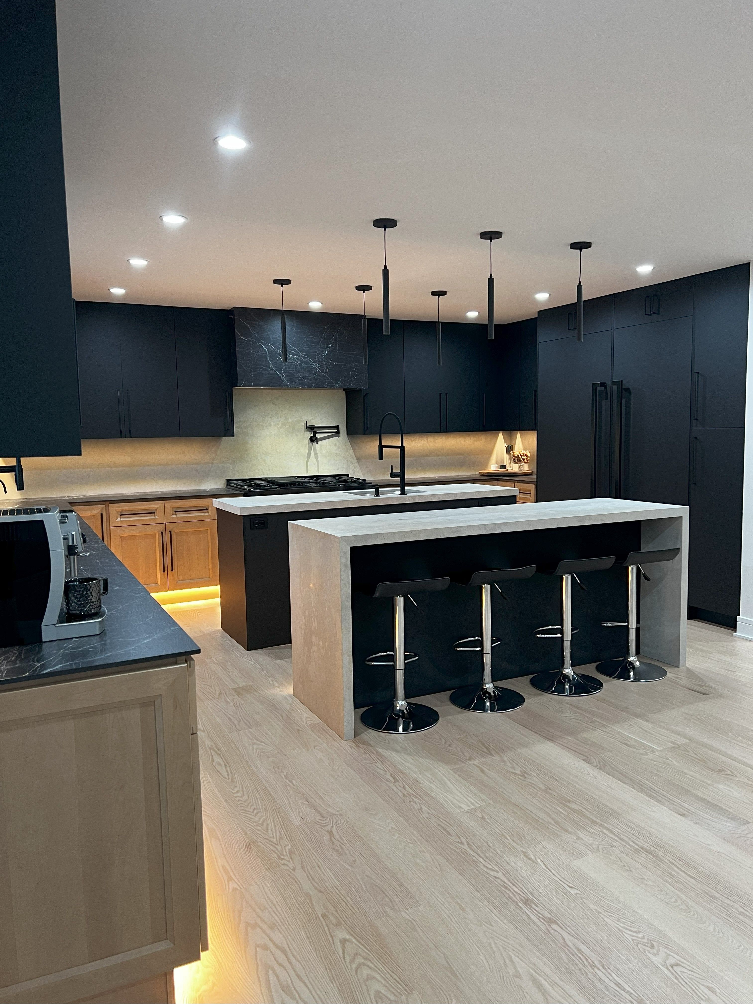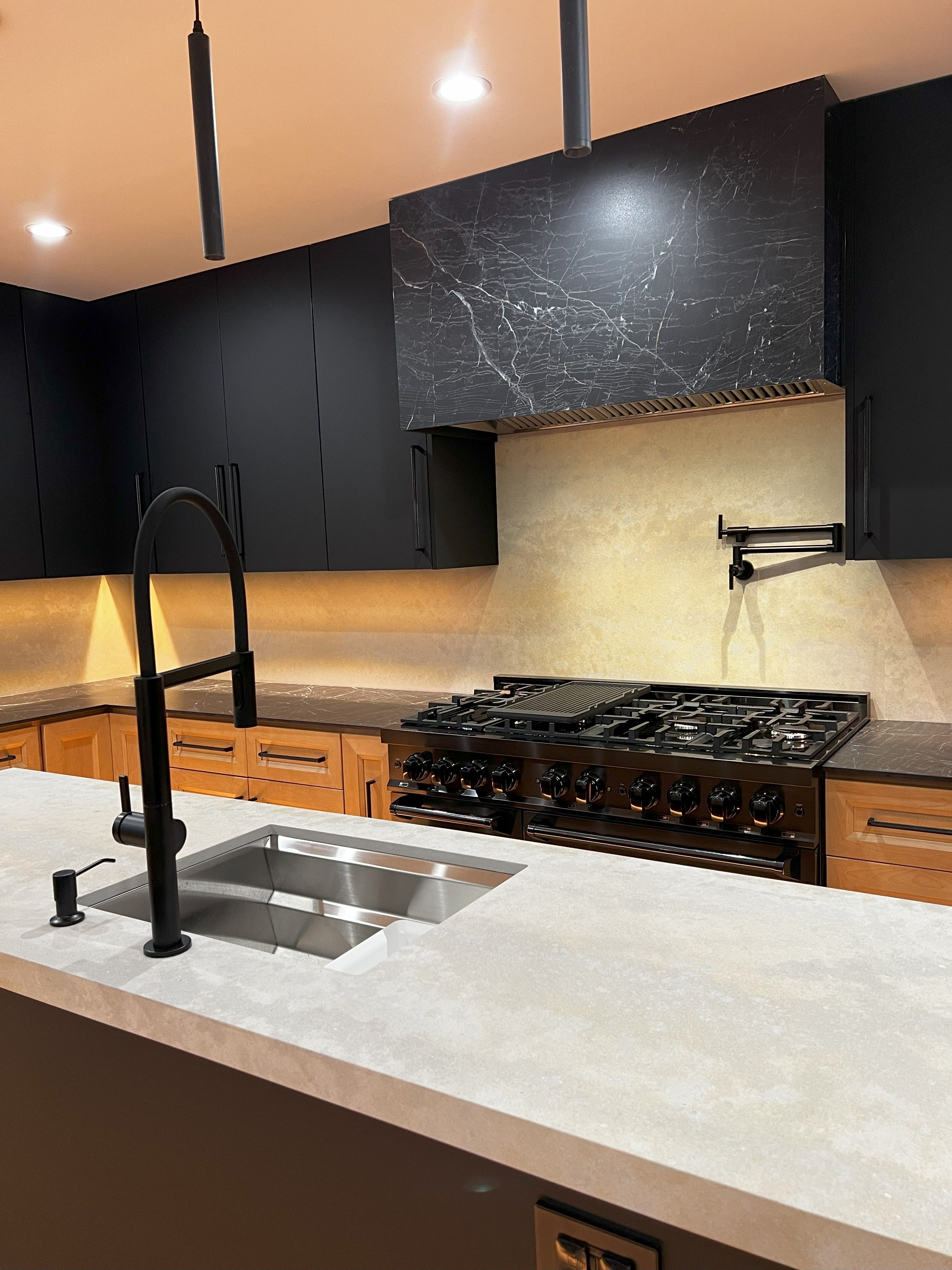 These Green Oaks homeowners selected the elegant Caesarstone Primordia quartz for their island countertops and full-height backsplash, creating a seamless, sophisticated look. To add striking contrast, they chose the stunning Dekton Somnia by Cosentino for the perimeter counters and hood wrap.