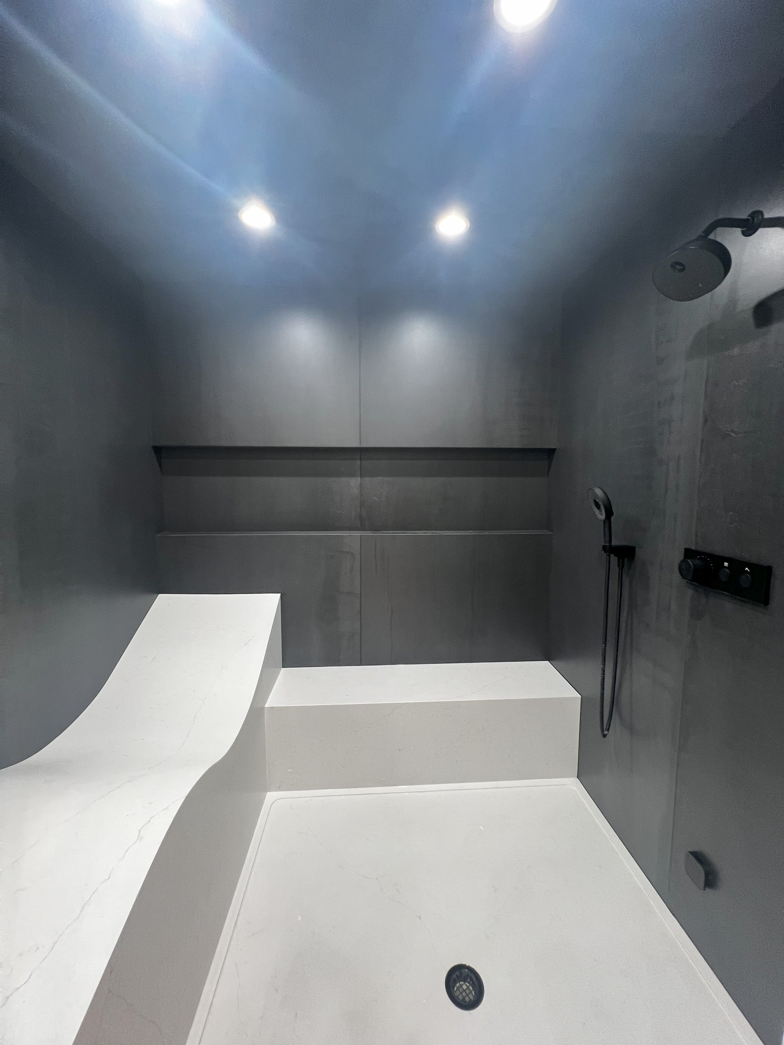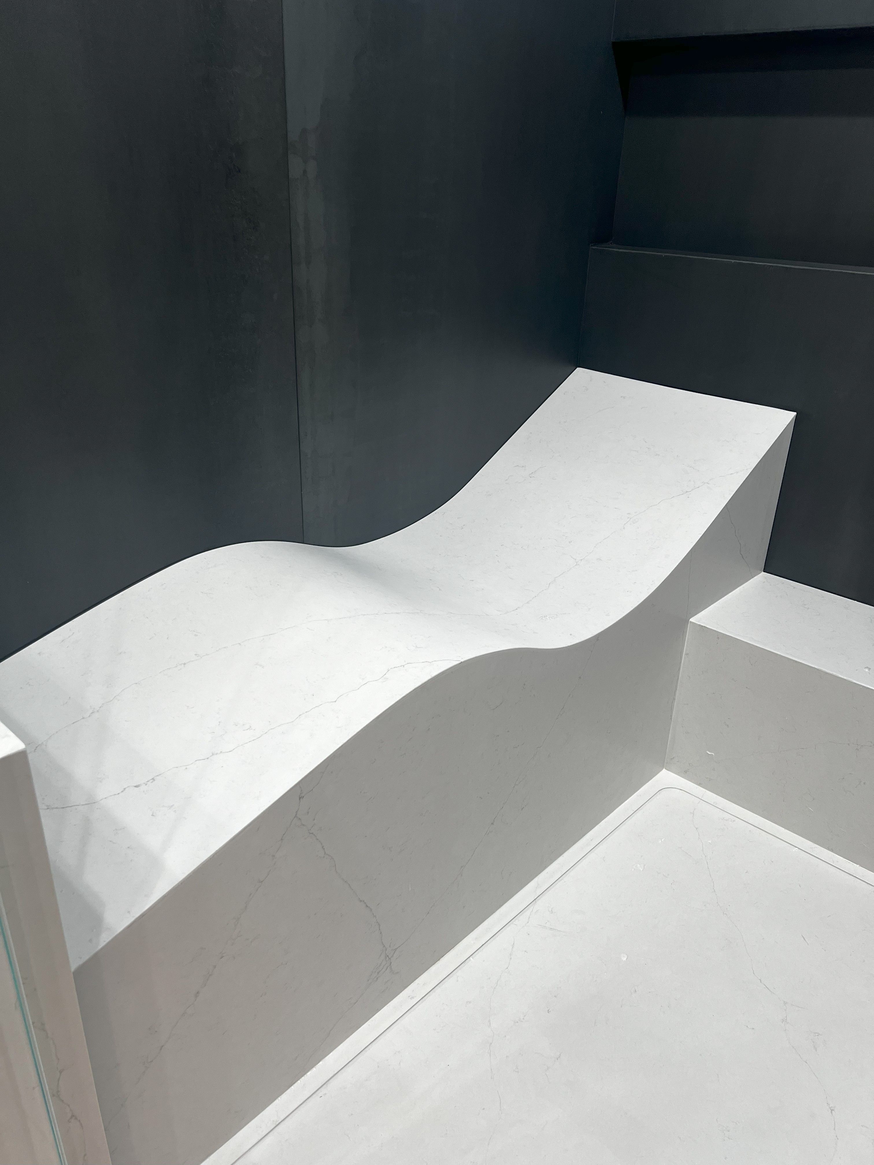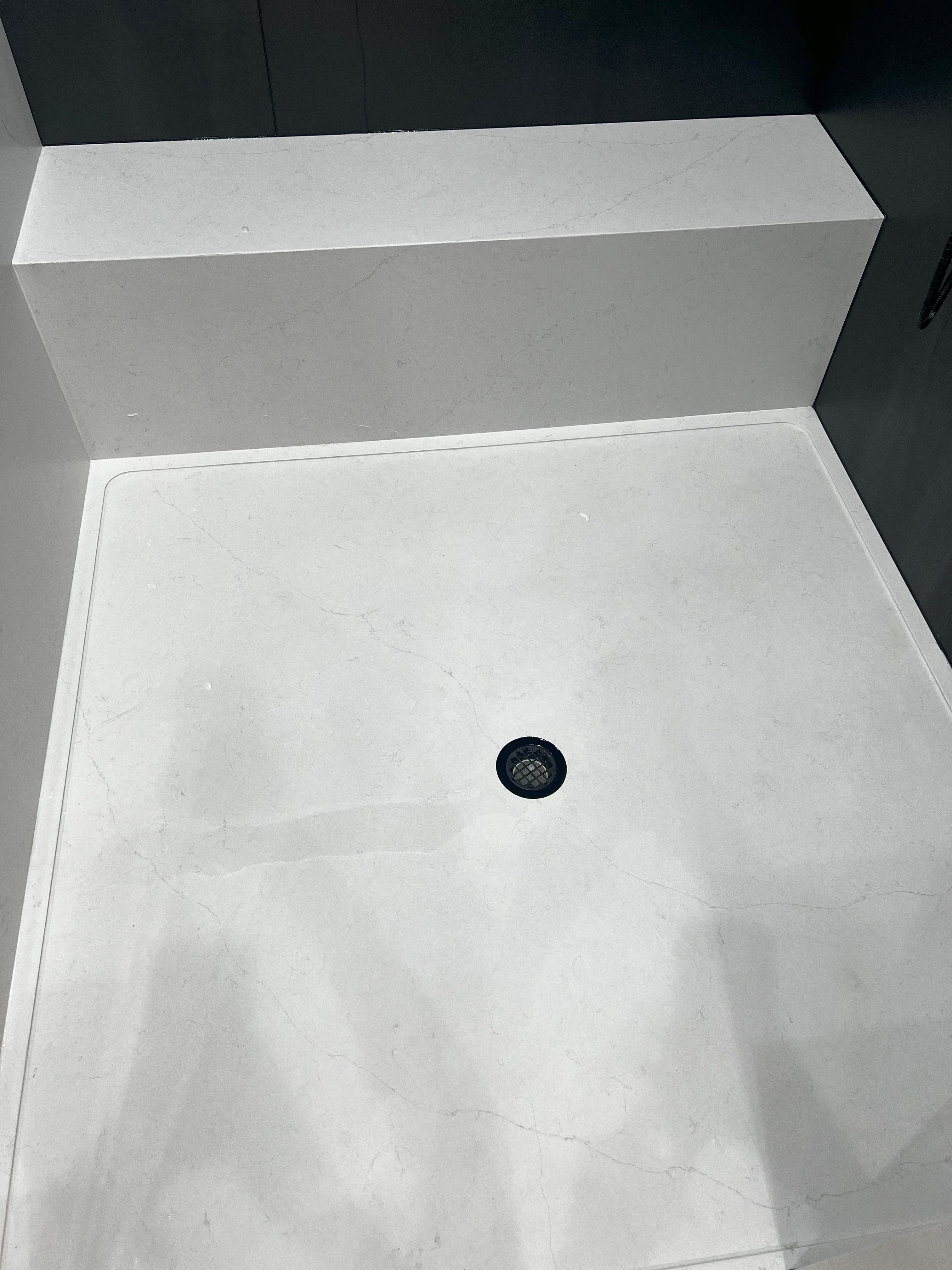 These Green Oaks homeowners elevated their bathroom design with Daltile’s Valor White quartz in a lava finish, used for the vanity top, custom shower bench, and shower base. For a bold, contemporary contrast, they selected Daltile’s Obsidian porcelain to finish the shower and vanity walls.