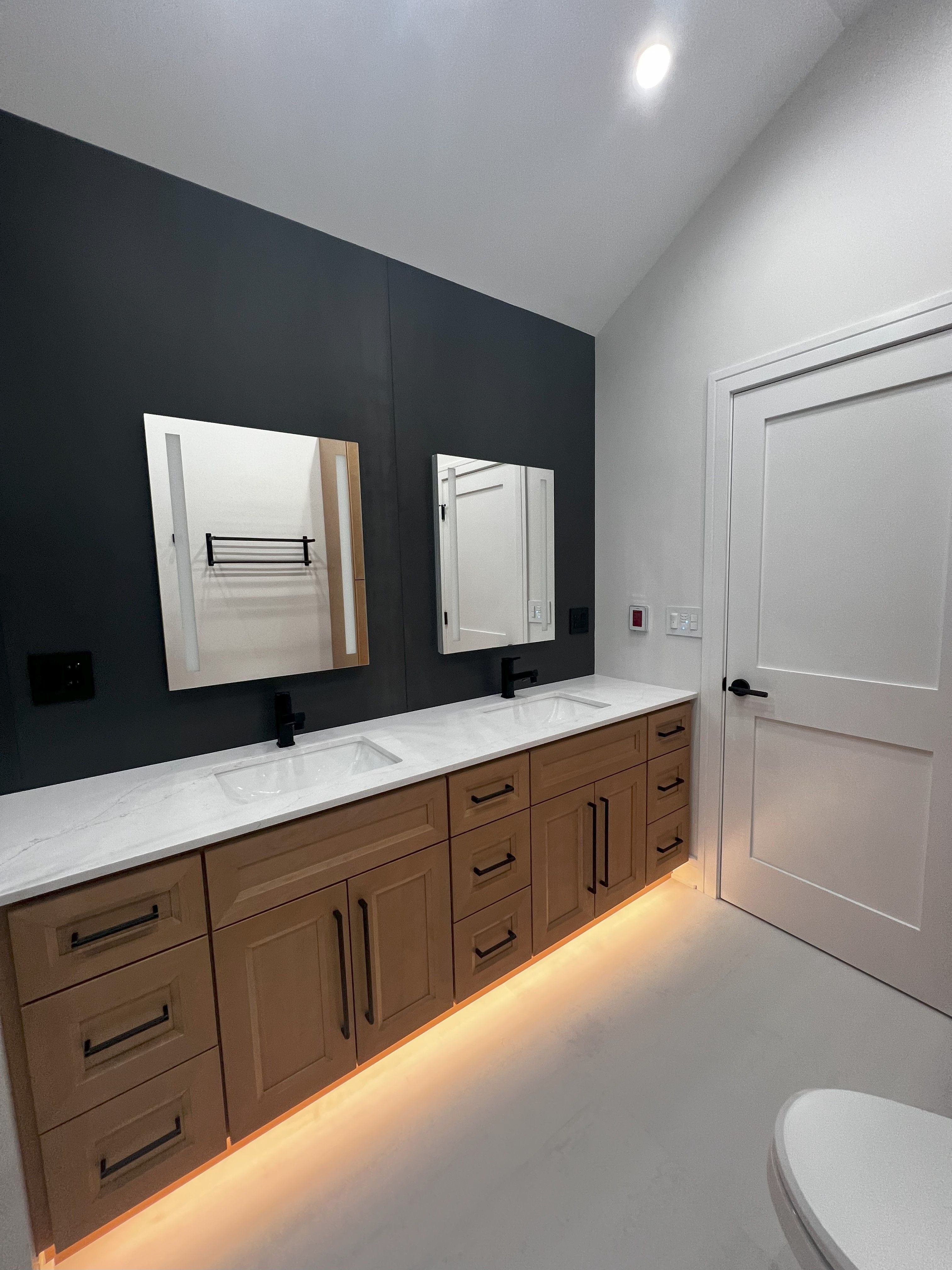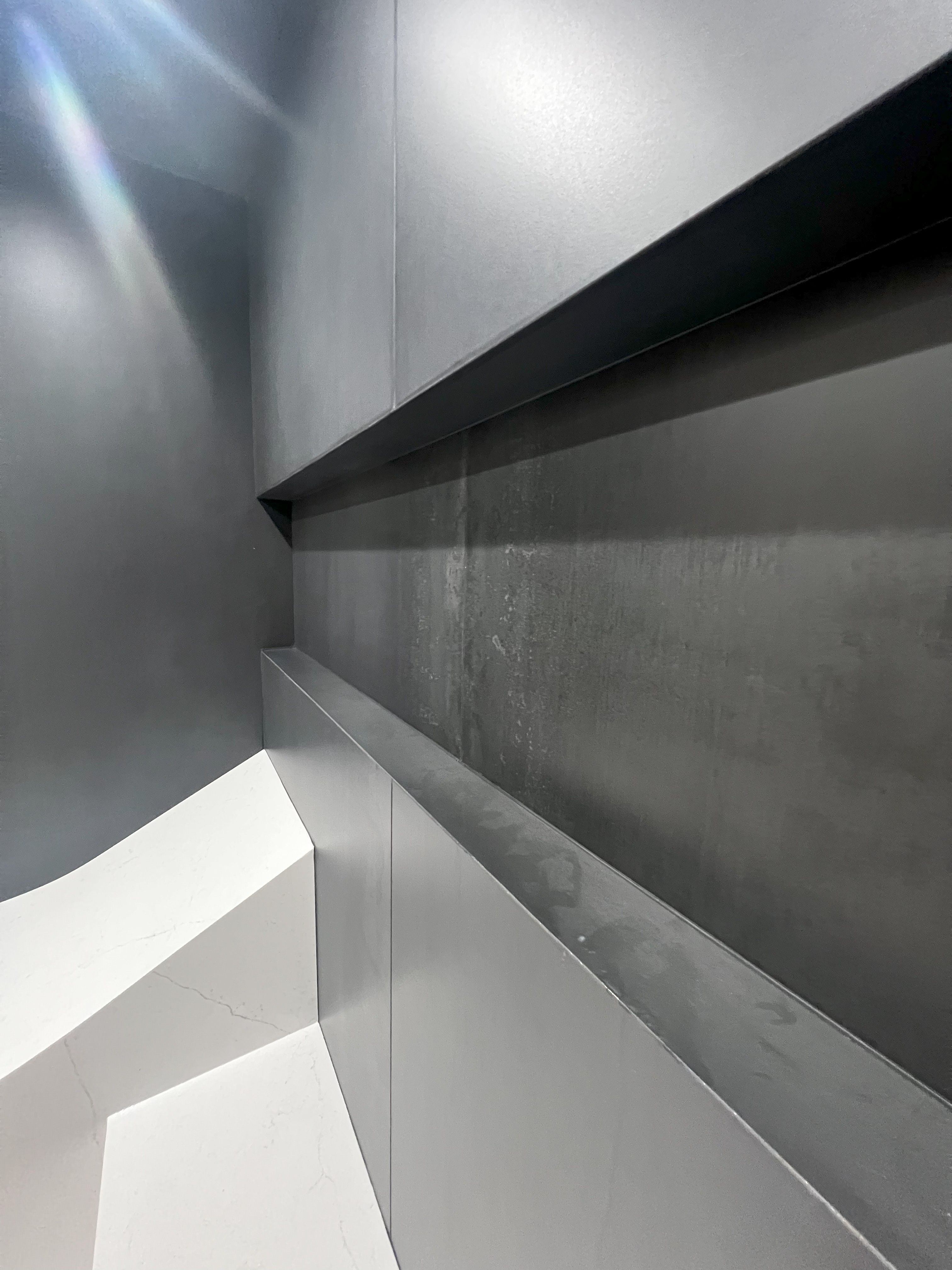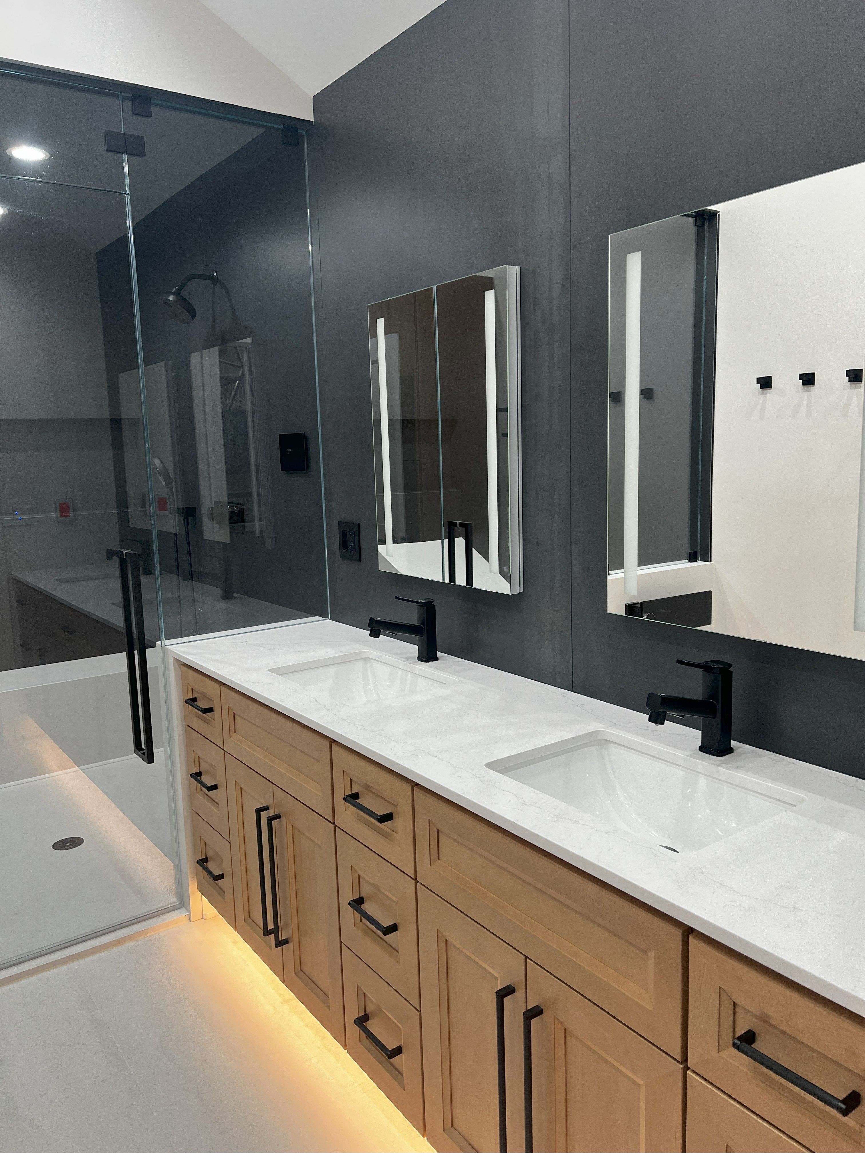 These Green Oaks homeowners elevated their bathroom design with Daltile’s Valor White quartz in a lava finish, used for the vanity top, custom shower bench, and shower base. For a bold, contemporary contrast, they selected Daltile’s Obsidian porcelain to finish the shower and vanity walls.
