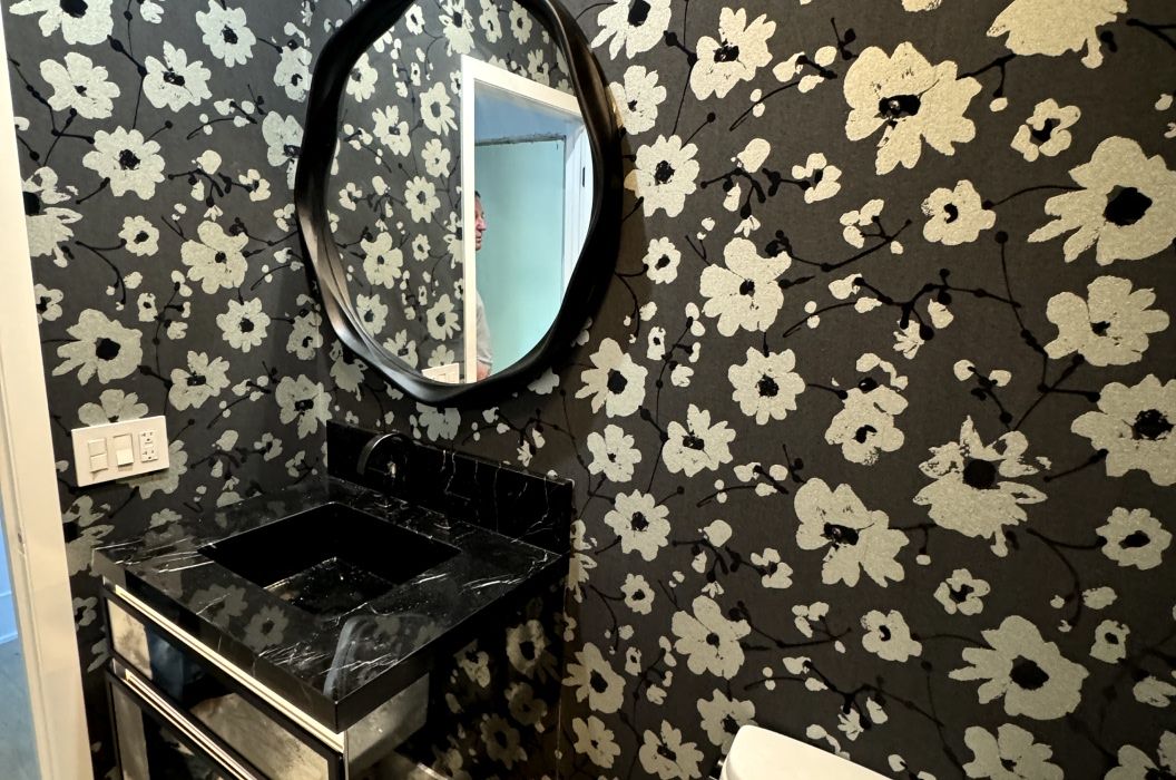 In addition to their hallway bathroom remodel, this Highland Park family reimagined their powder bathroom. While the space is compact, the vanity serves as the focal point, enhanced by the striking Nero Marquina marble from Terrazzo and Marble used for the vanity top.