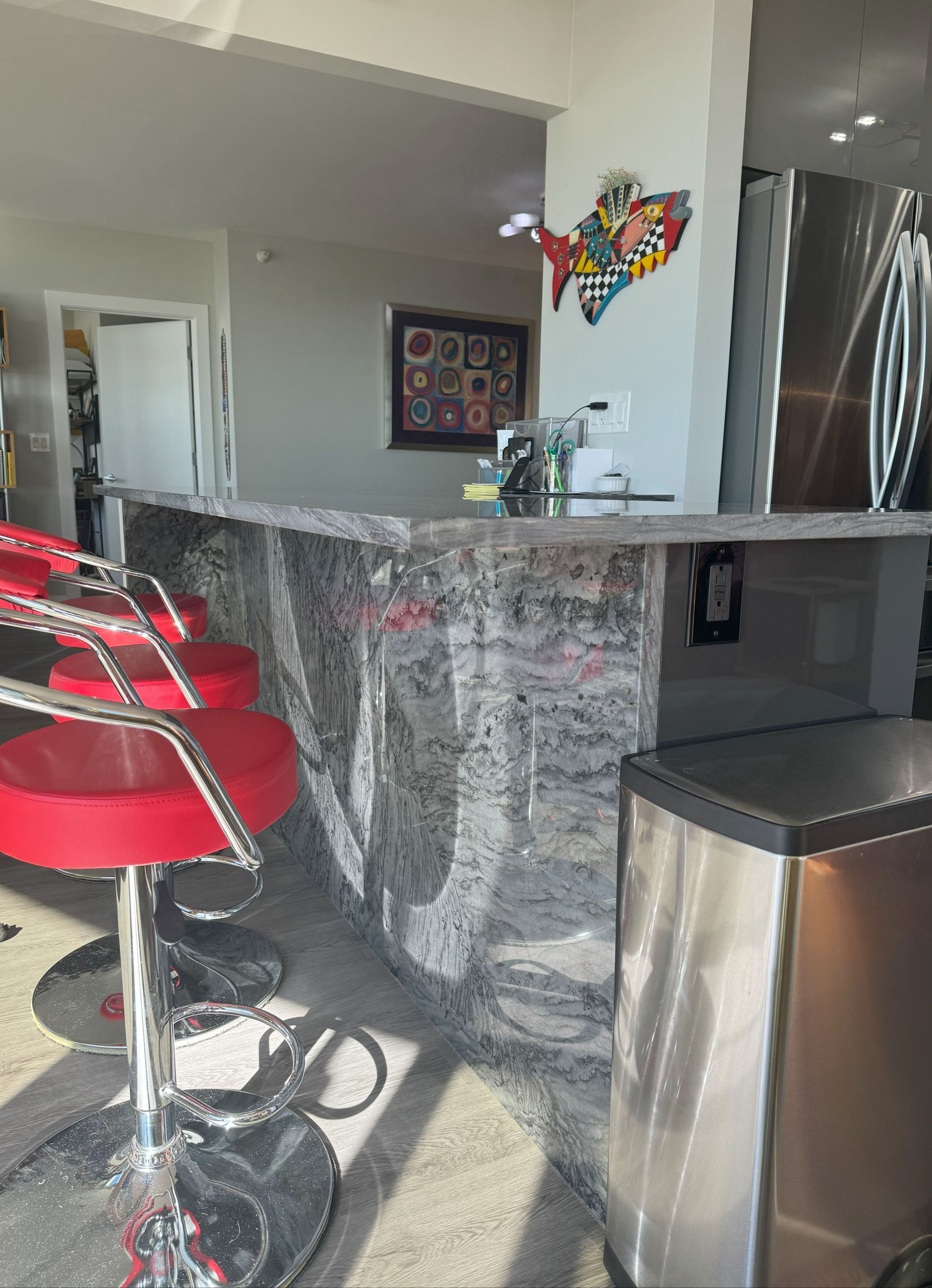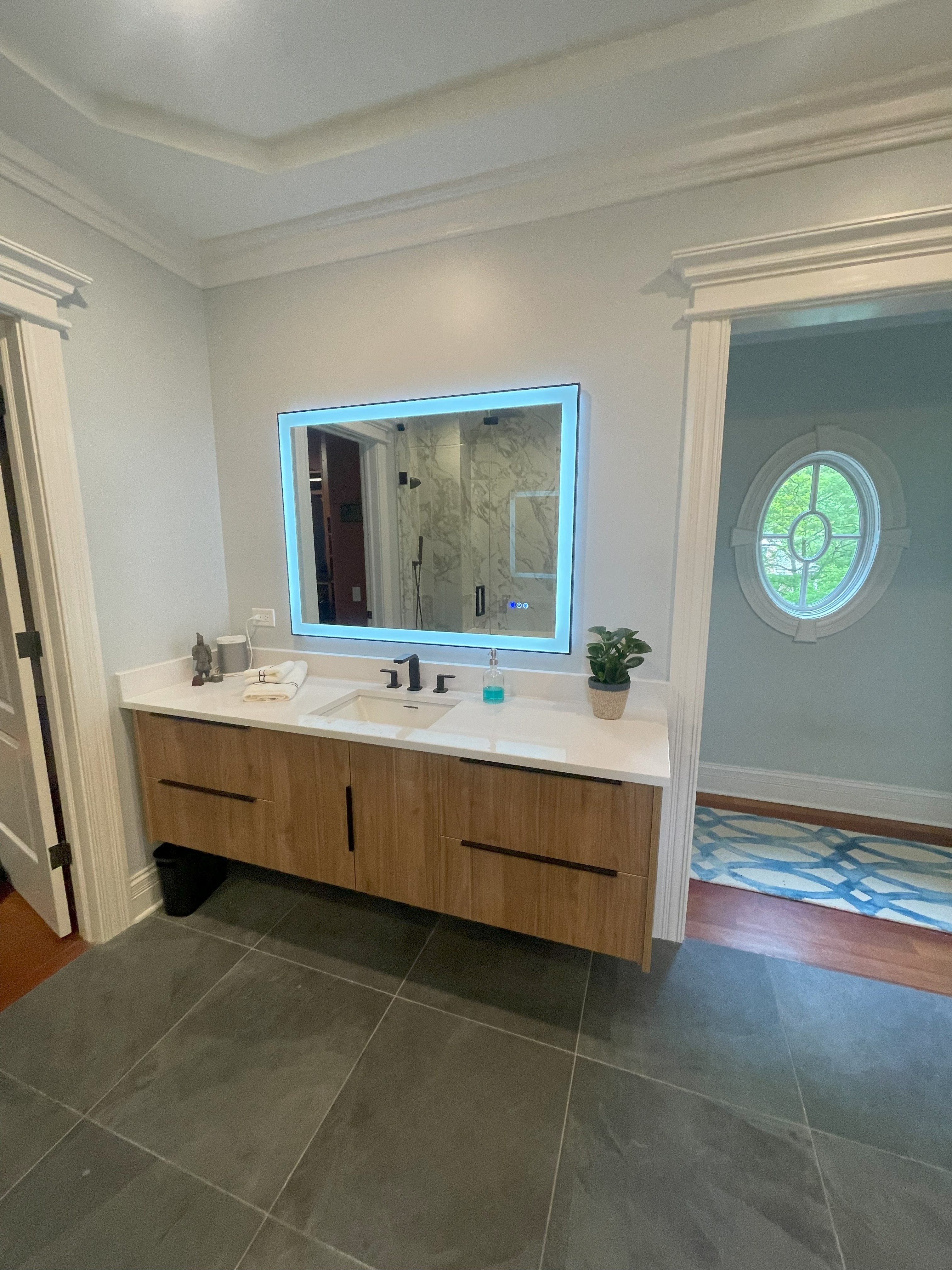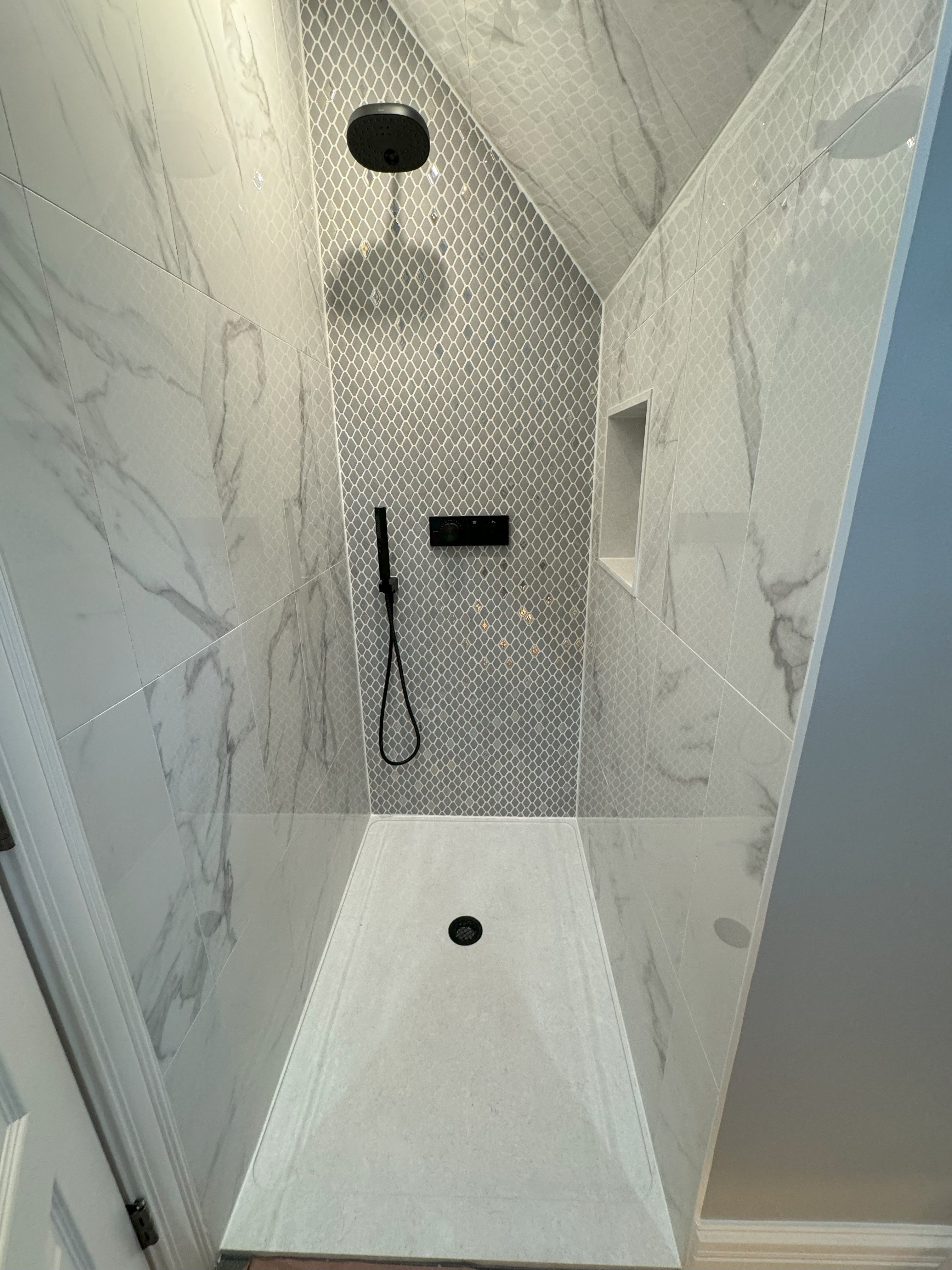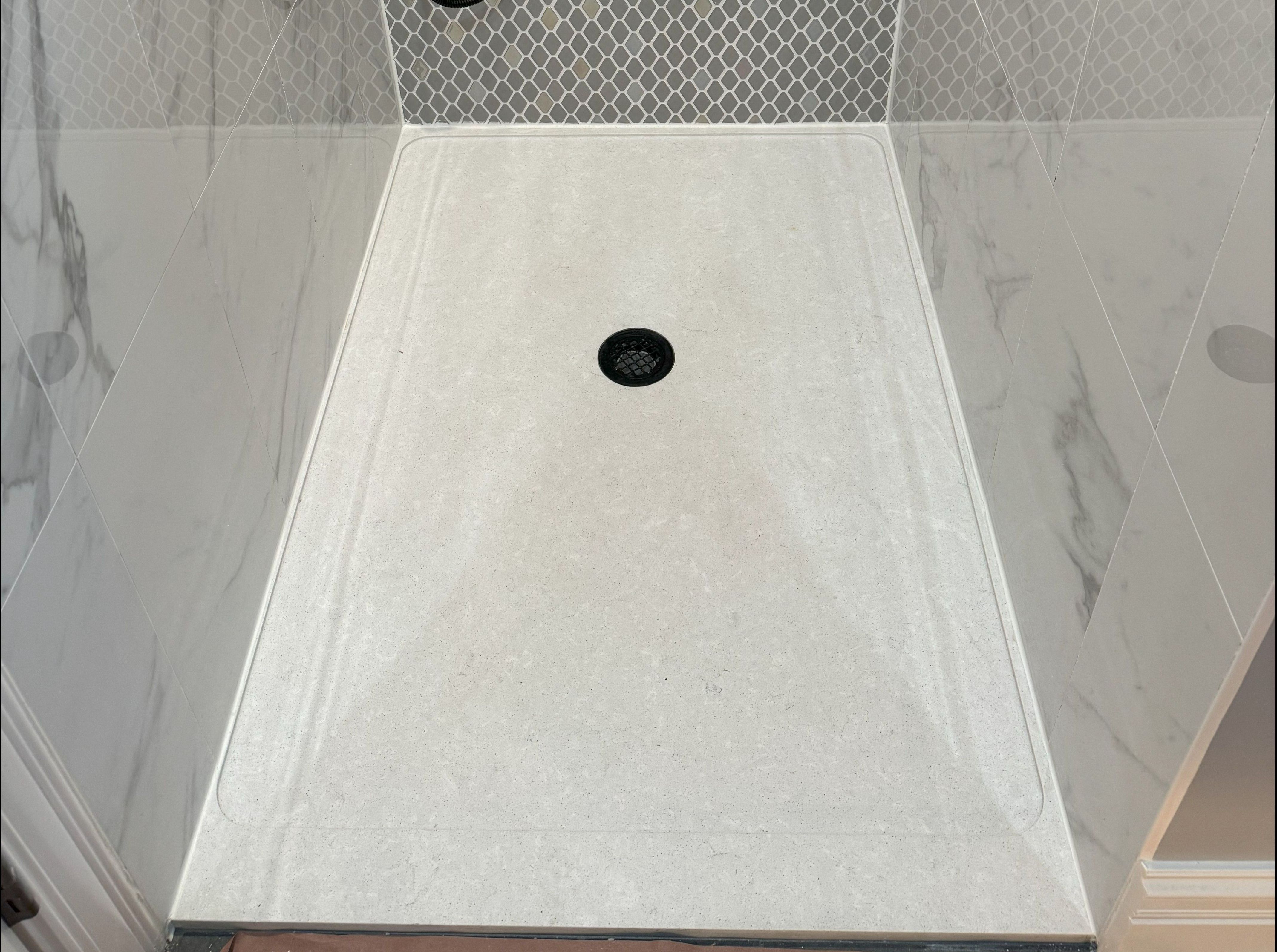 For their guest bathroom, the Kenilworth family chose Daltile’s Coronado White Quartz for the vanity top, shower niche, and Atlantis Trident Quartz shower base, achieving a clean and bright look.