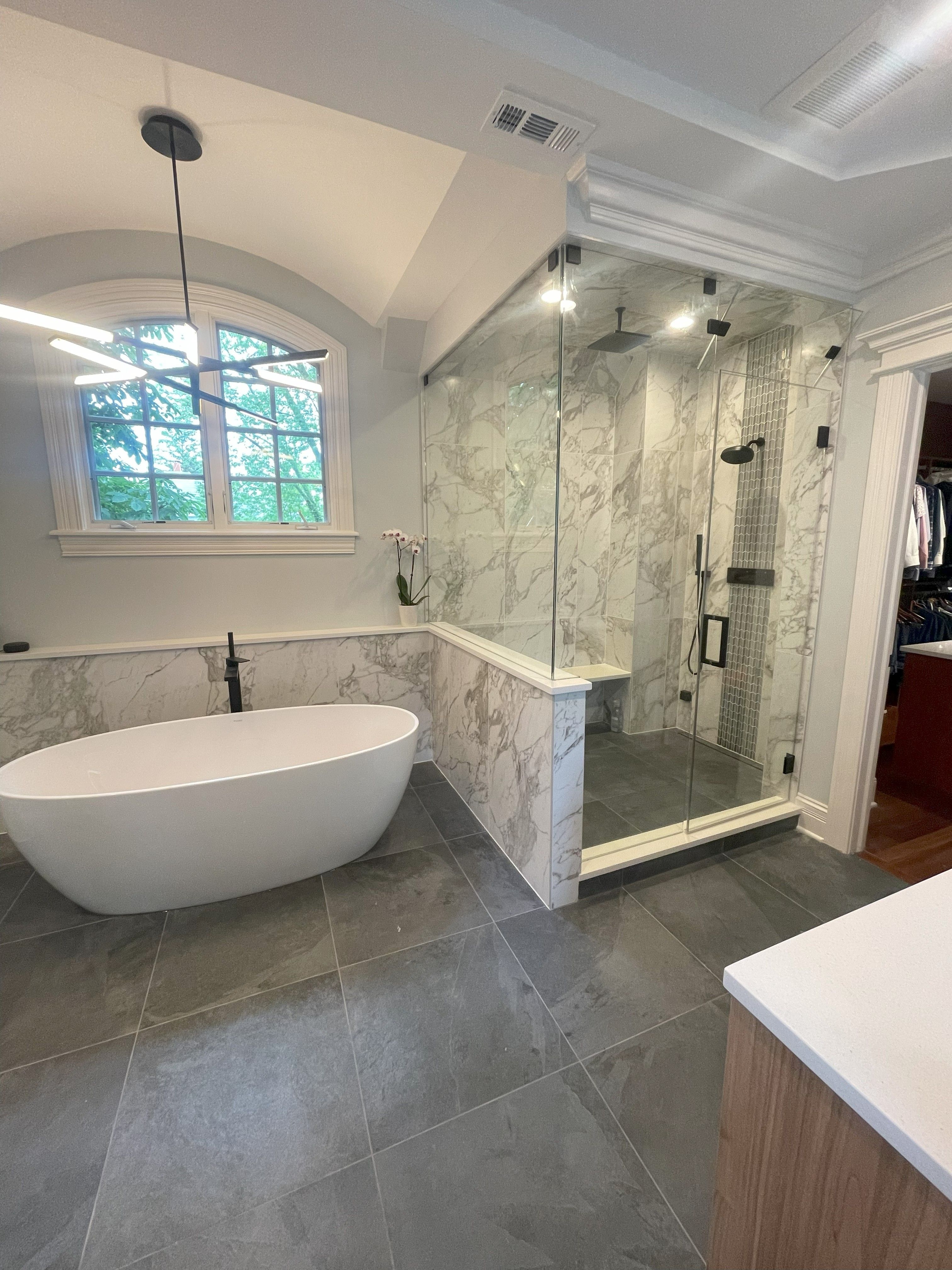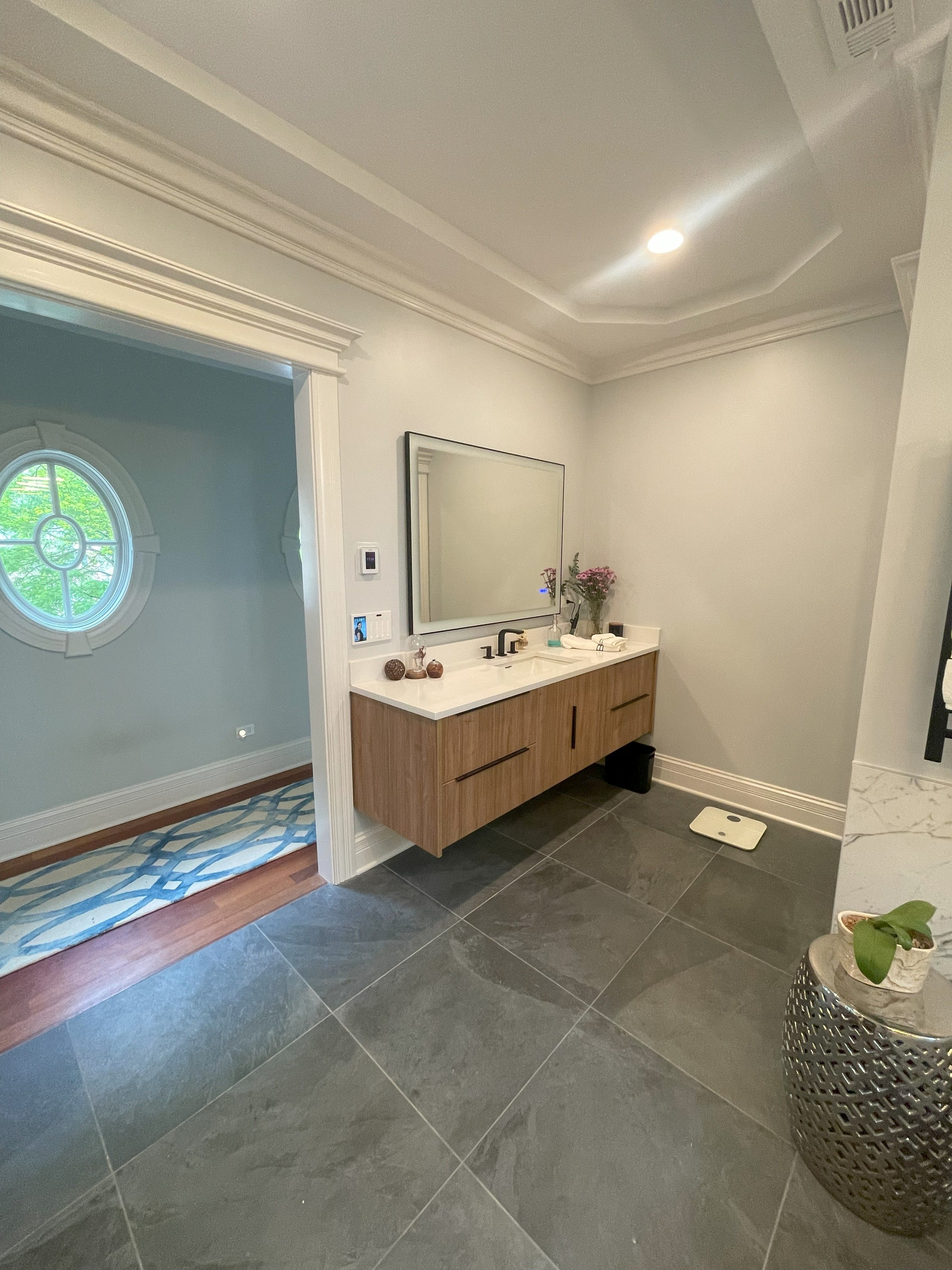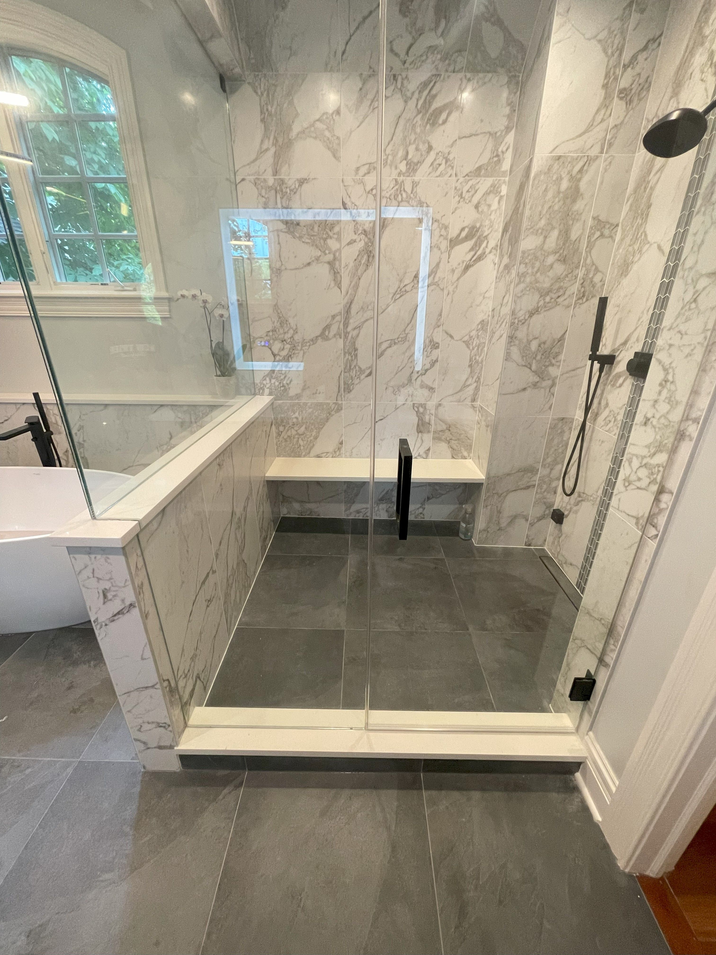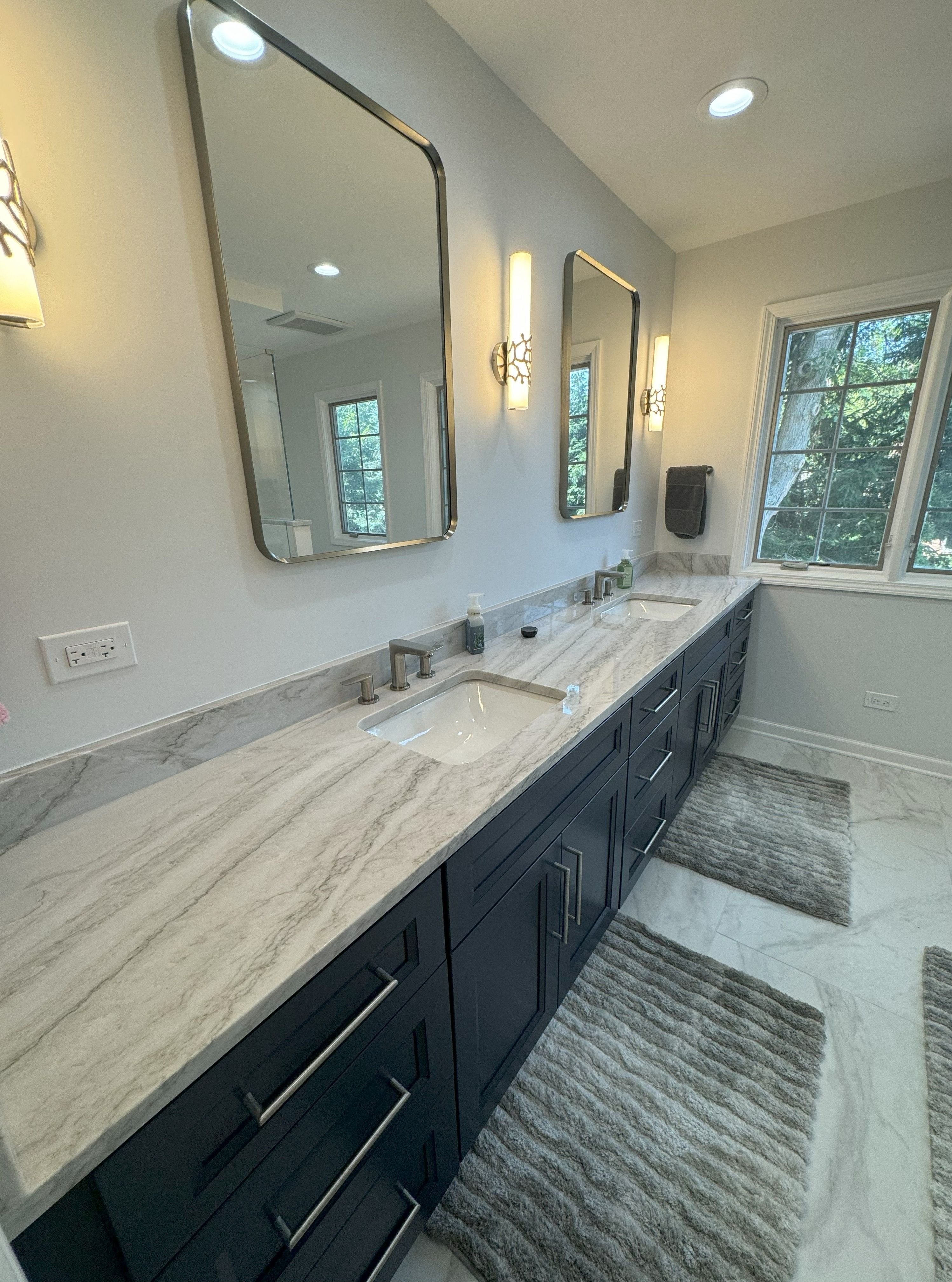 This Kenilworth family undertook four major bathroom remodels in their home. In the newly redesigned master bathroom, they selected Daltile’s White Ice Quartz for the vanity tops, shower bench, and shower threshold, creating a sleek, sophisticated look.
