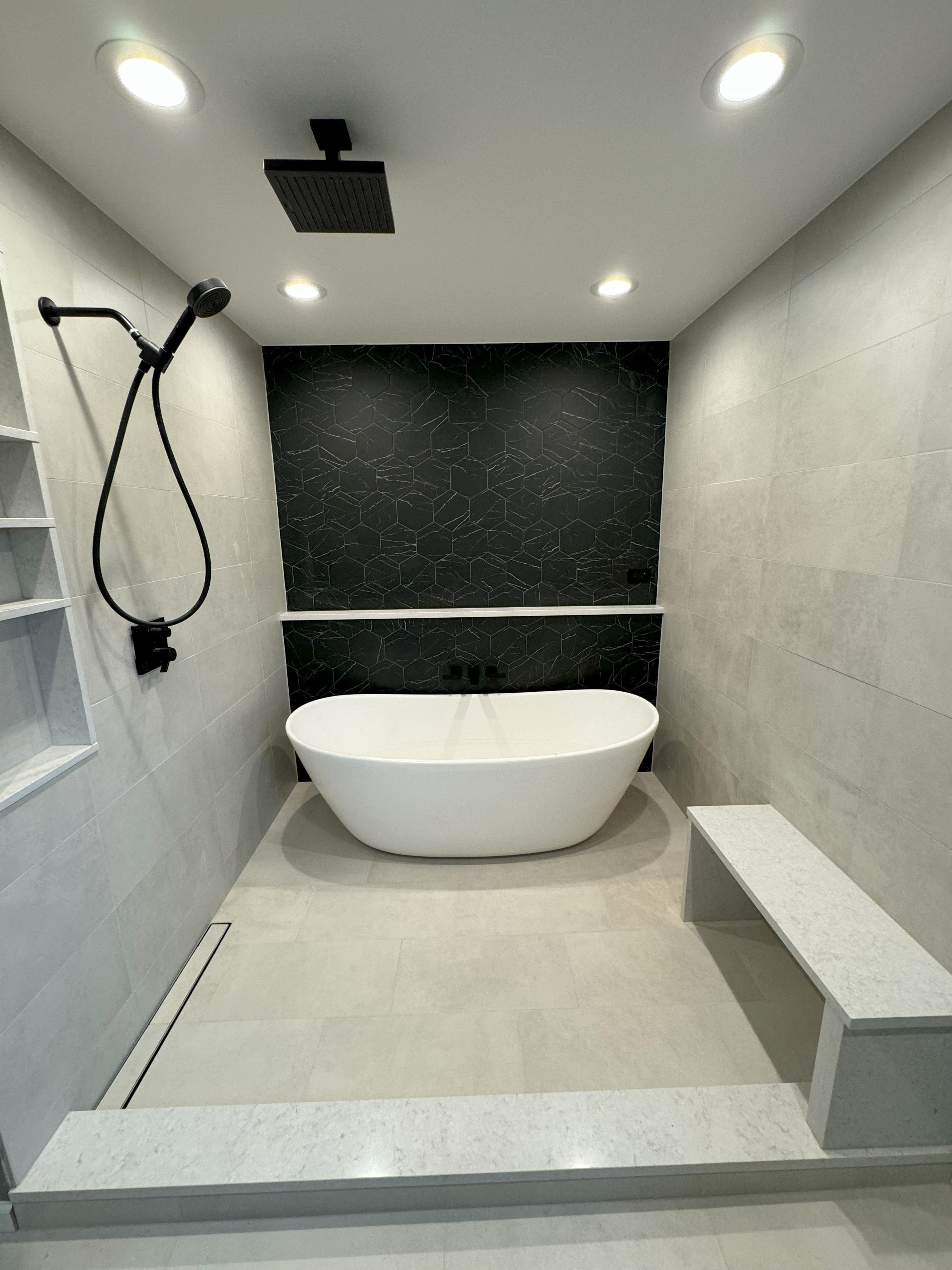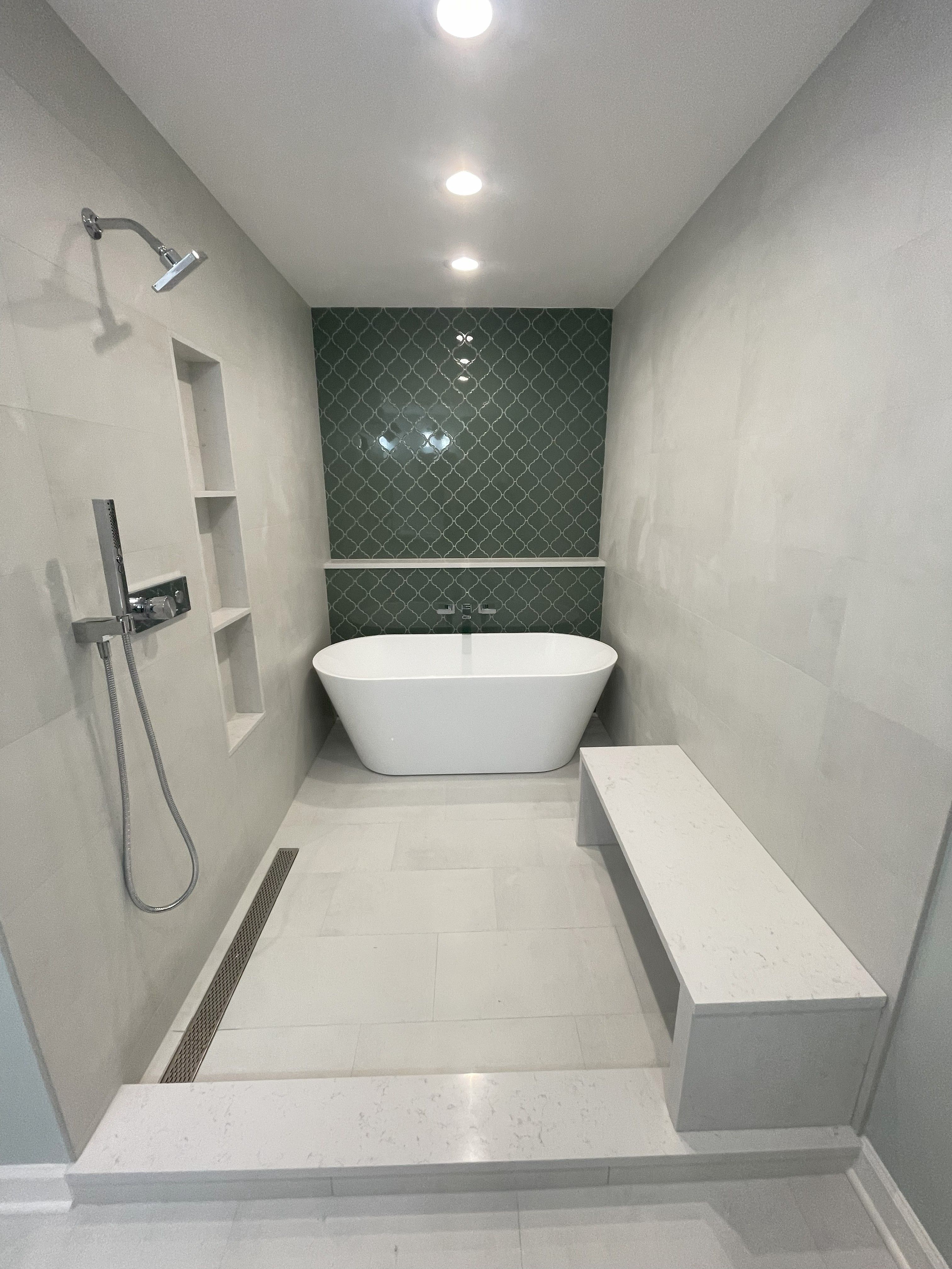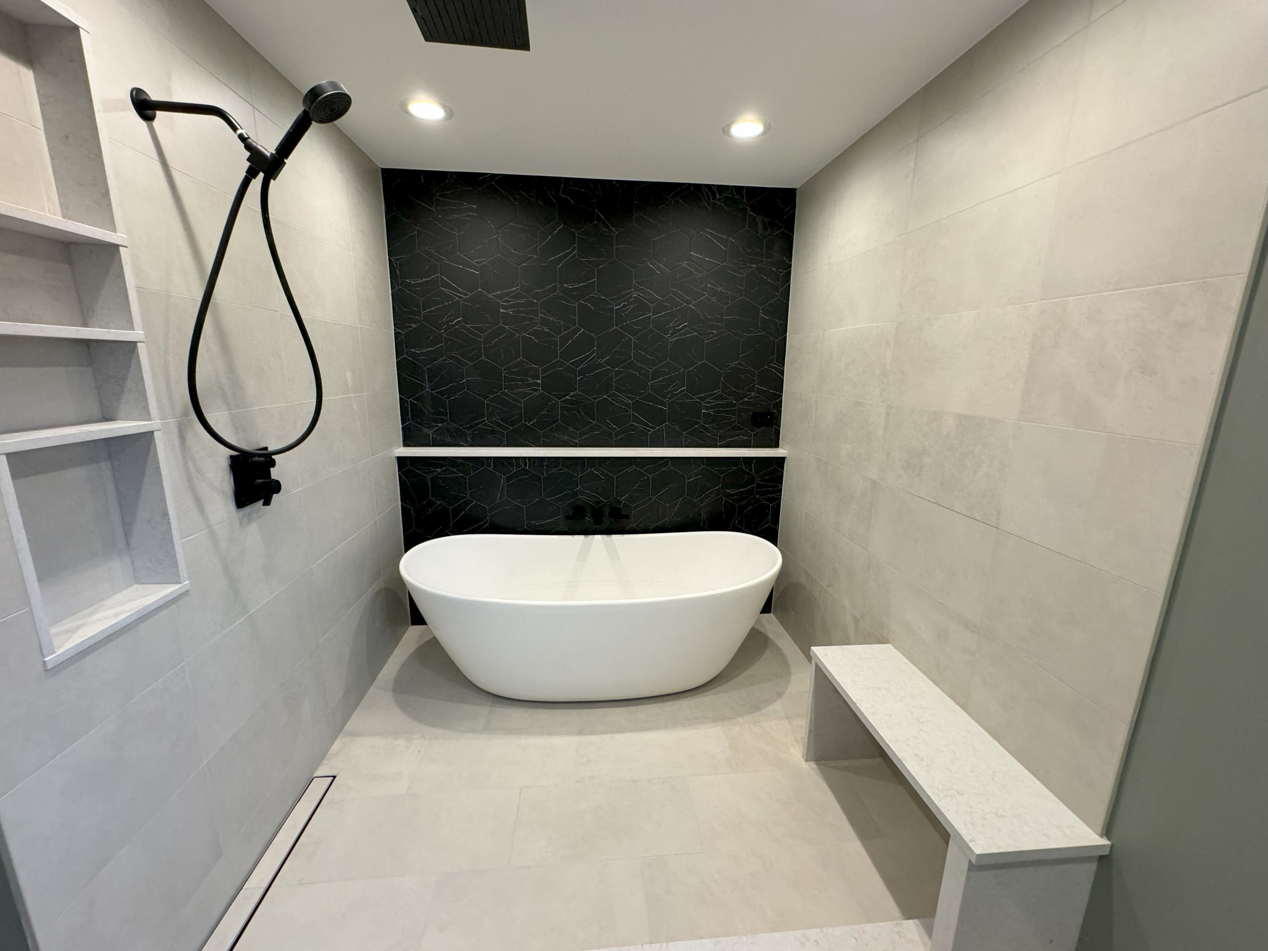 These Libertyville homeowners chose Daltile’s Golden Gate Quartz for their vanity tops, shower bench, niche, threshold, and tub ledge to enhance the look of their sleek new master bathroom.